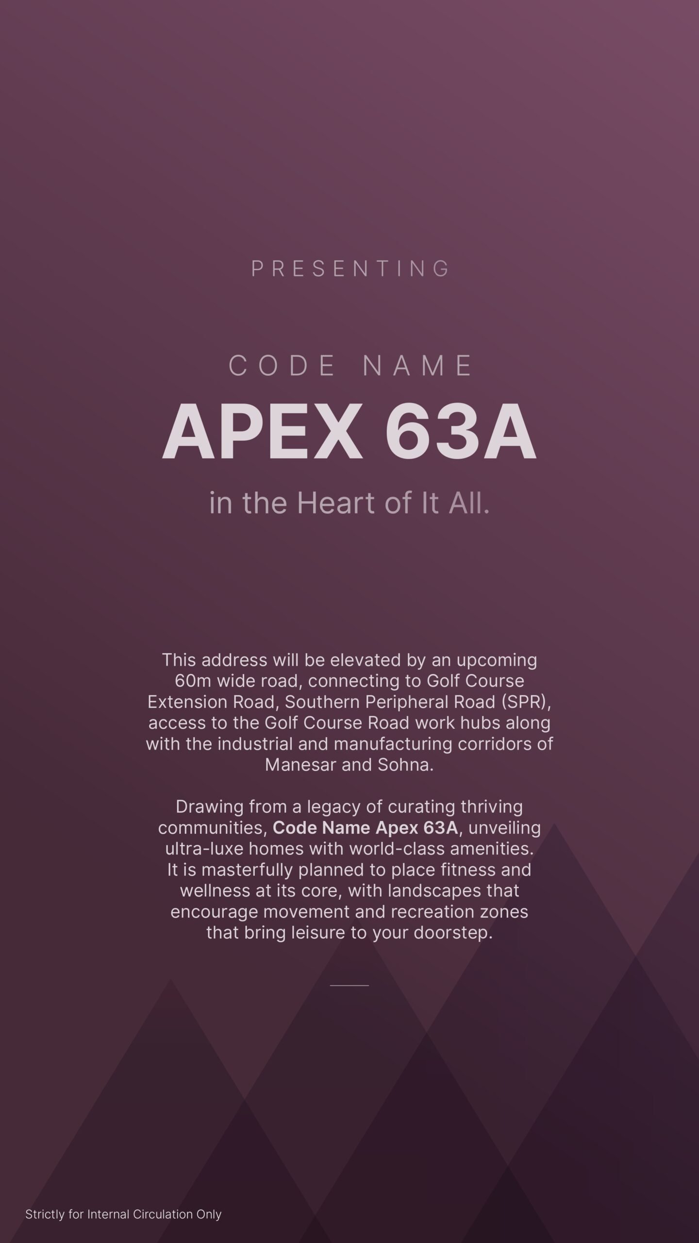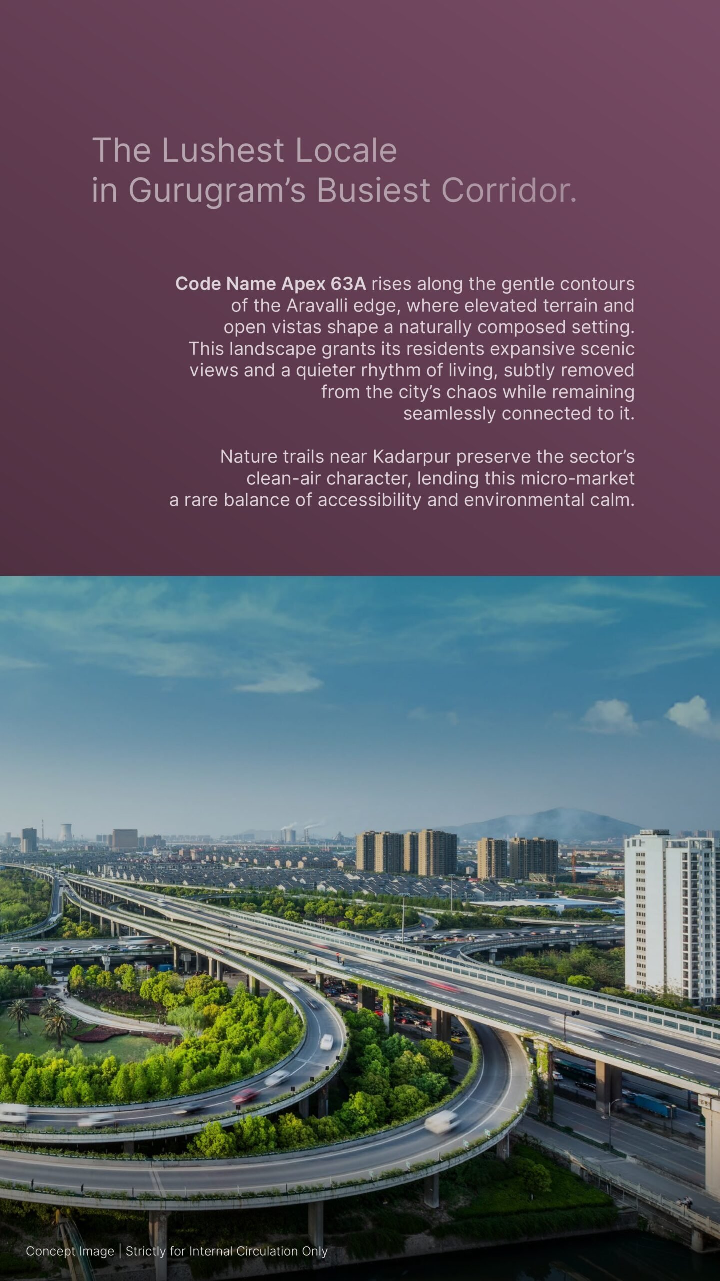 APEX 63A Sector 63A Gurgaon, Golf Course Extension Road (GCER). Code Name APEX 63A is an ultra-luxury residential development located in Sector 63A, Gurugram, along the Golf Course Extension Road (GCER). The project is situated at the edge of the Aravalli Hills, offering residents expansive scenic views and a tranquil living environment while maintaining seamless connectivity to major urban hubs.