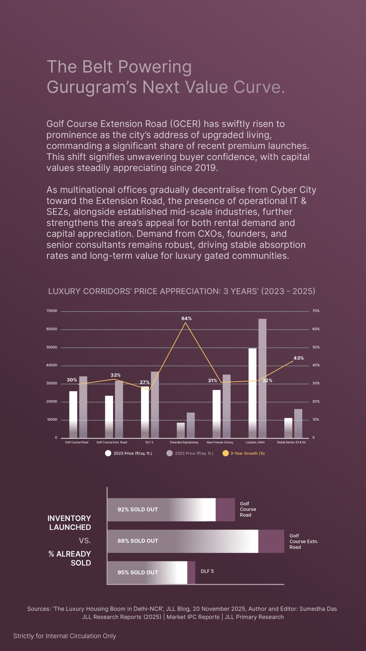 Golf Course Extension Road has seen significant capital appreciation, with values steadily rising since 2019. The corridor currently experiences high demand from CXOs and founders, with luxury inventory absorption rates as high as 95% in the surrounding area.