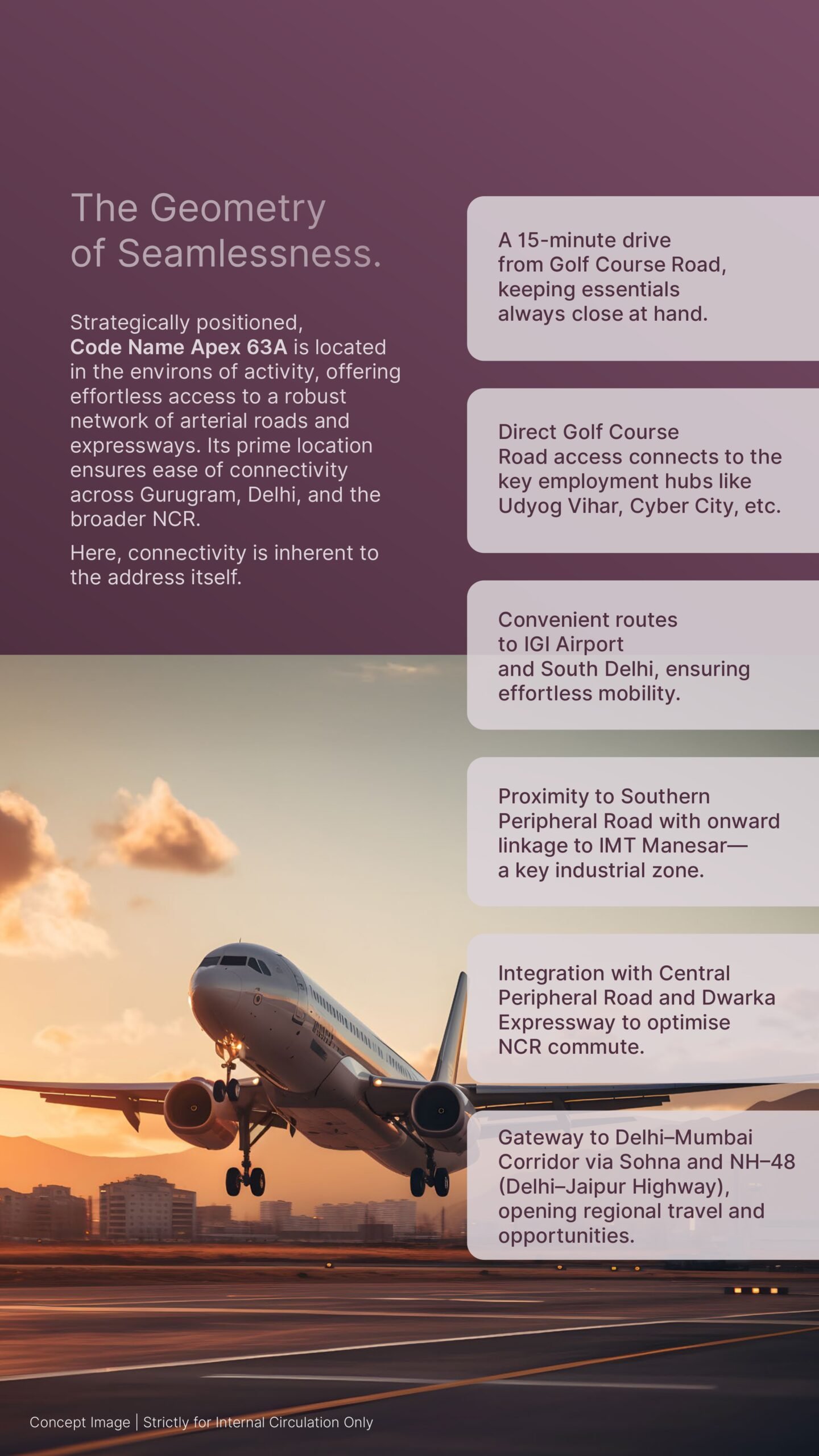 • Proximity: Less than 10 minutes from Golf Course Road and 15 minutes from key employment hubs like Cyber City and Udyog Vihar.