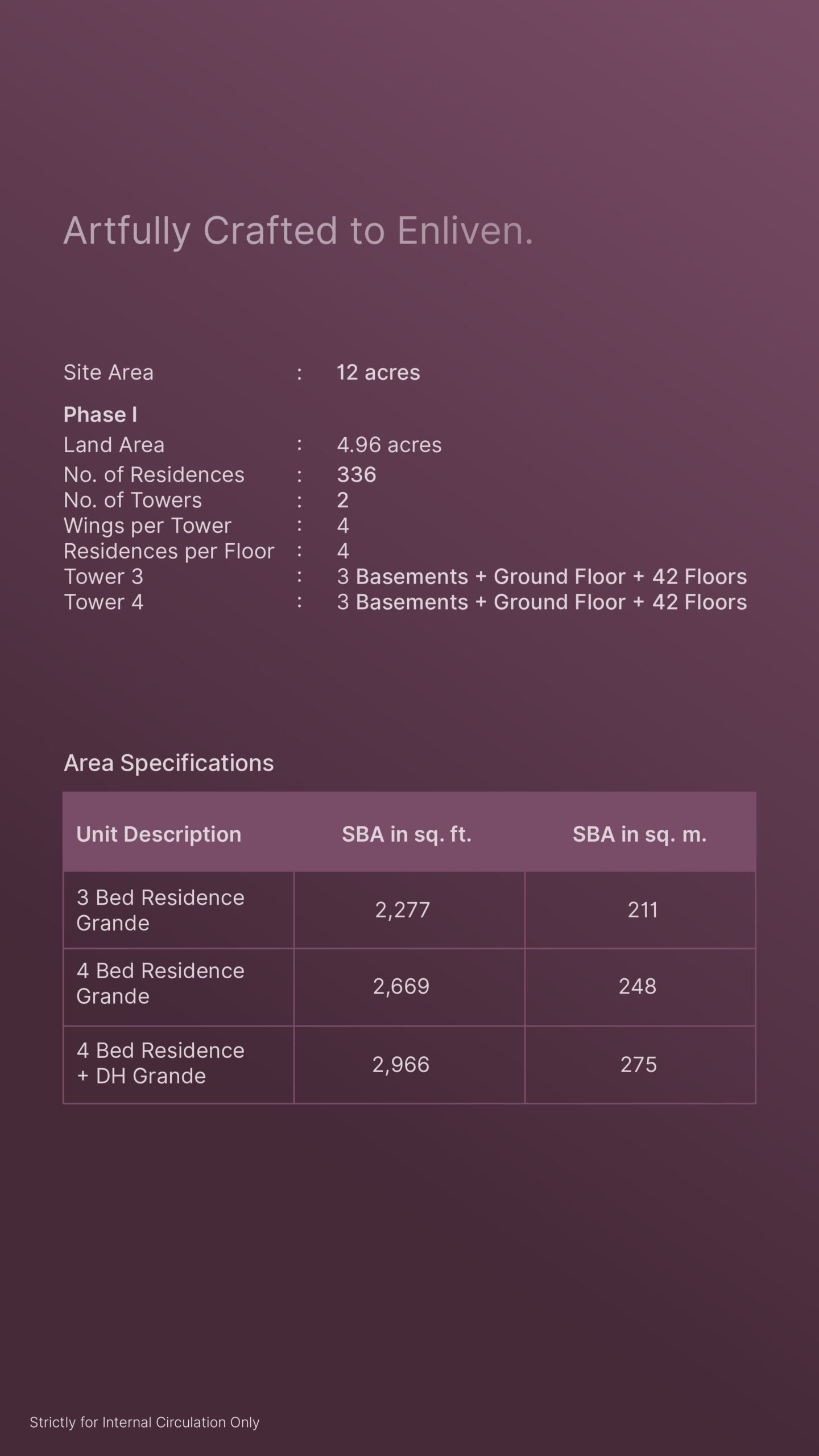 • Density: 4 residences per floor with 4 wings per tower, totaling 336 residences in Phase I.