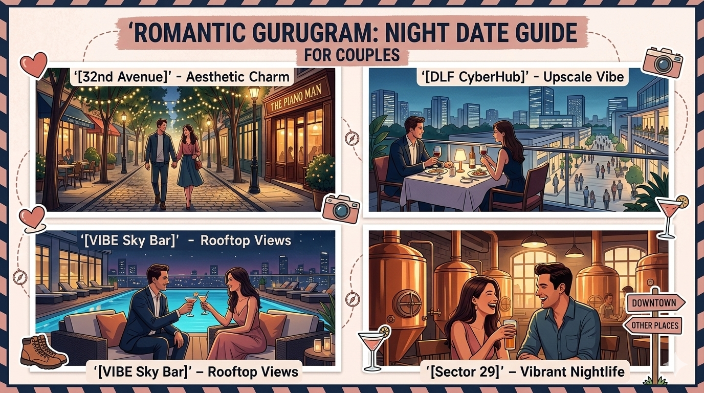 Gurugram transforms at night, offering everything from high-energy entertainment hubs to intimate rooftop settings perfect for a romantic evening. Whether you are looking for a sophisticated dinner or a lively walk under the lights, the city has several distinct zones that cater to different moods.