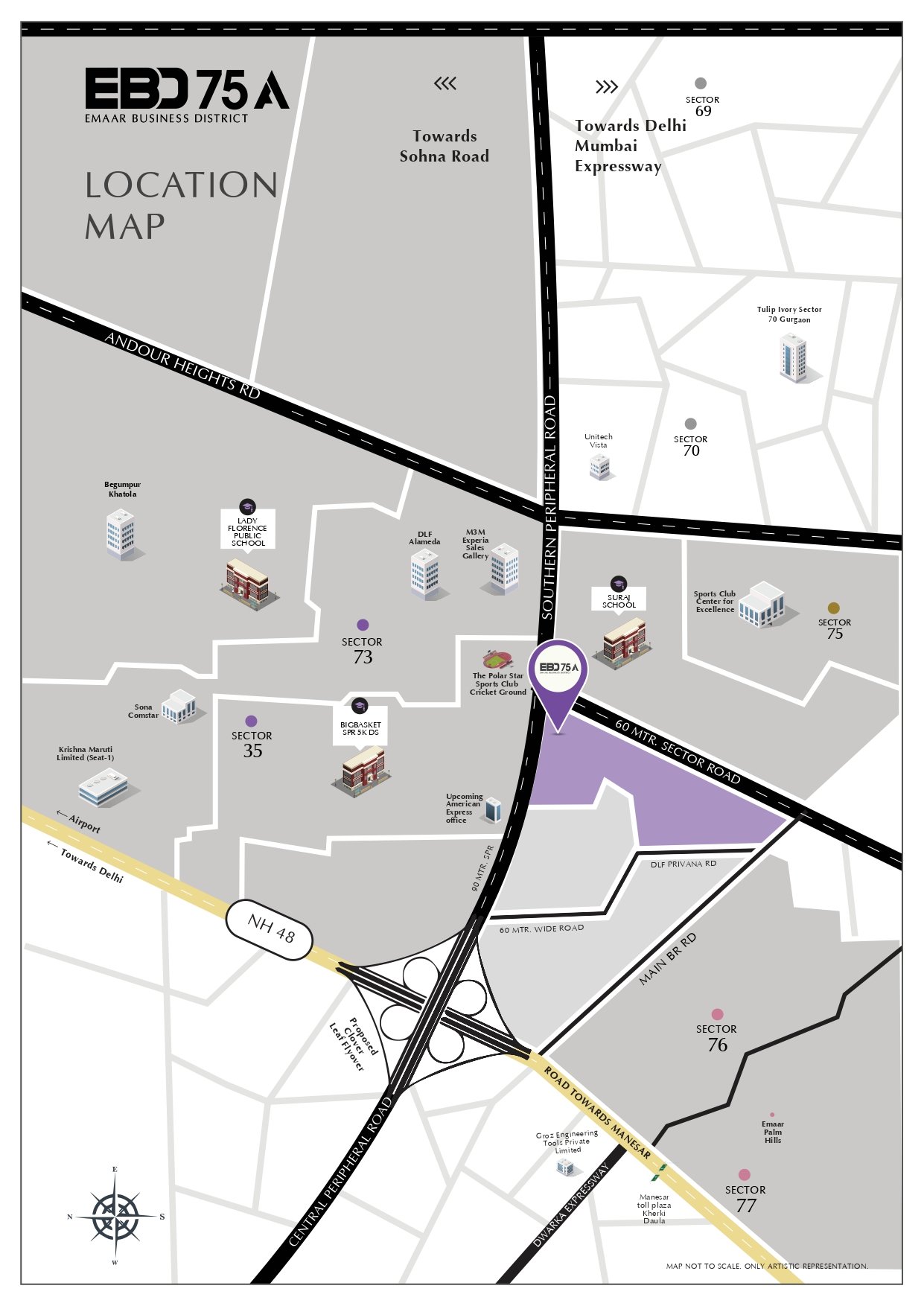 Emaar SCO Plots SPR Road Sector 75A Gurgaon – Emaar EBD 75A Southern Peripheral Road, Gurugram is a premium Shop-Cum-Office (SCO) plotted colony designed to offer a unique blend of retail and office spaces. Located in the rapidly developing growth corridor of Gurugram, this project provides investors the flexibility to construct assets tailored to their specific business vision.