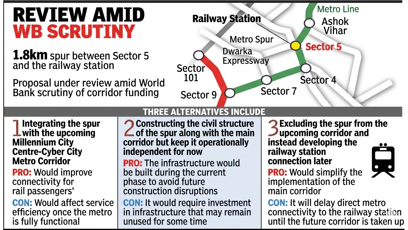 With operational and funding complications associated with the main metro project under consideration, three options have been suggested for the 1.8km-long spur from Sector 5 to railway station.