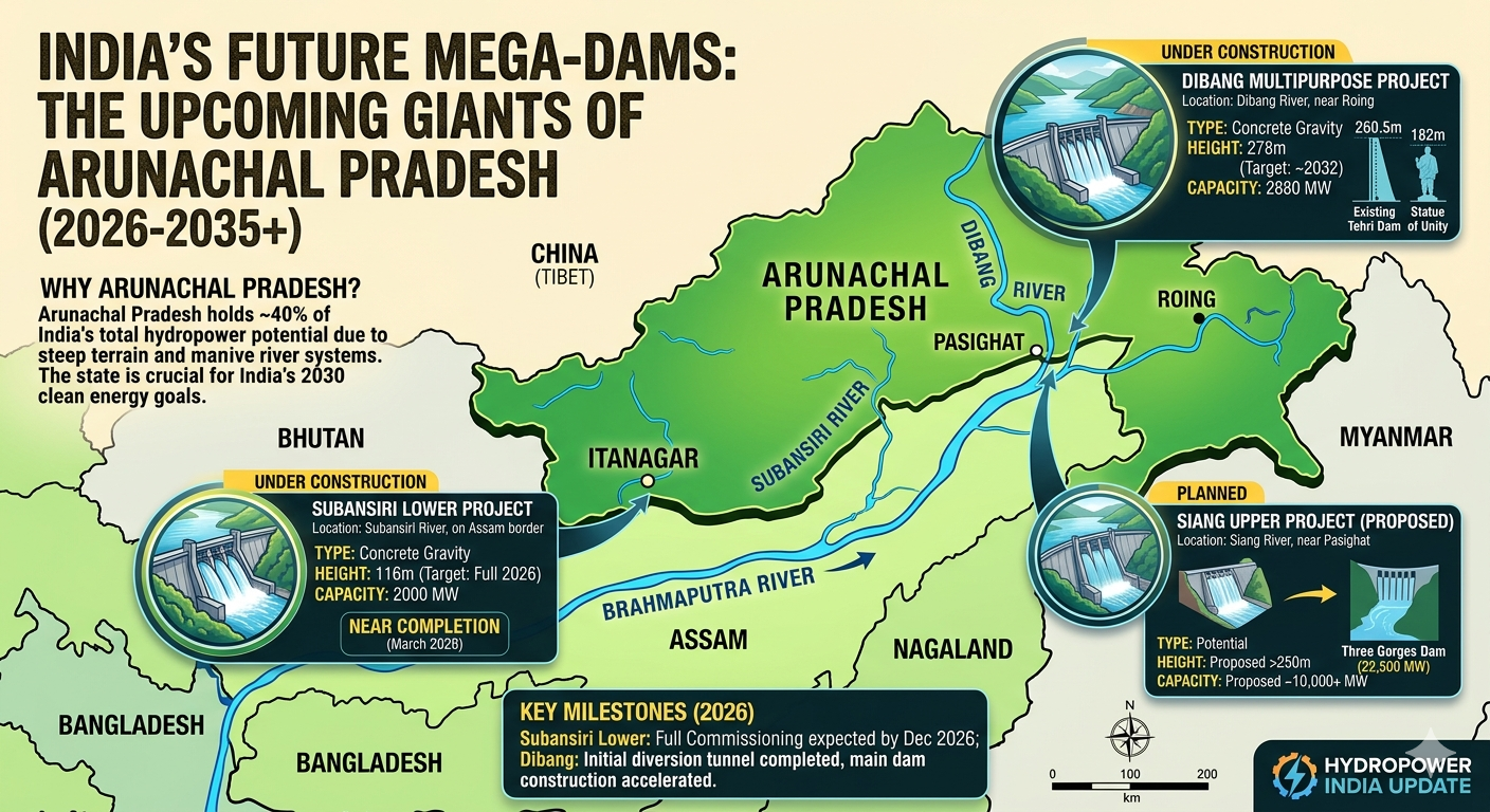 Future Giants India is now considering a “mega-dam” on the Siang River in Arunachal Pradesh Upon completion (at a proposed height of nearly 280 meters), this would ultimately dethrone the Tehri Dam, becoming the tallest dam in India.