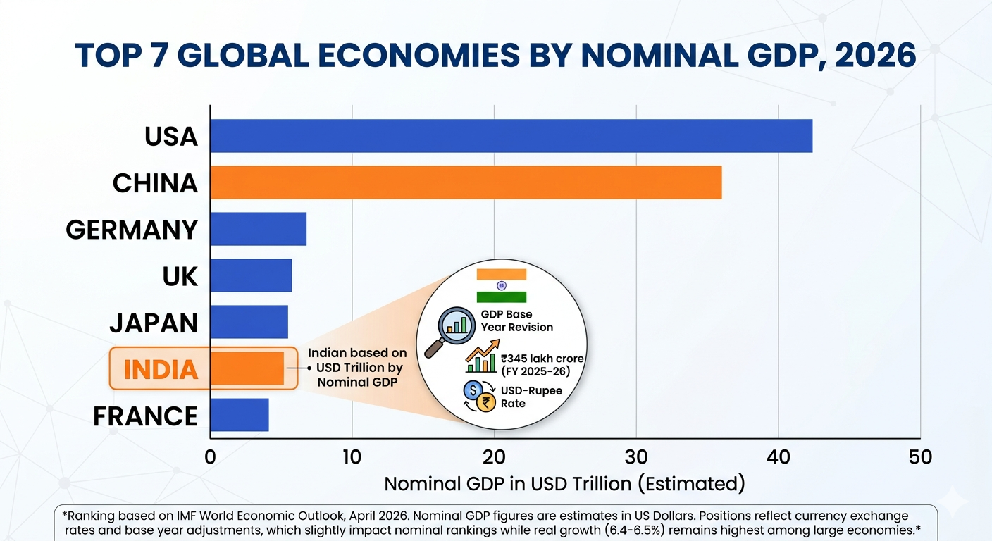 Revision of GDP Base Year: India revised the base year for the calculation of its GDP in early 2026. When the new calculations were done, nominal GDP in 2025-26 was revised down from around ₹357 lakh crore then to ₹345 lakh crore thereafter, resulting in a seemingly inevitable reduction of the gap that had until then allowed India to keep its lead over the UK.