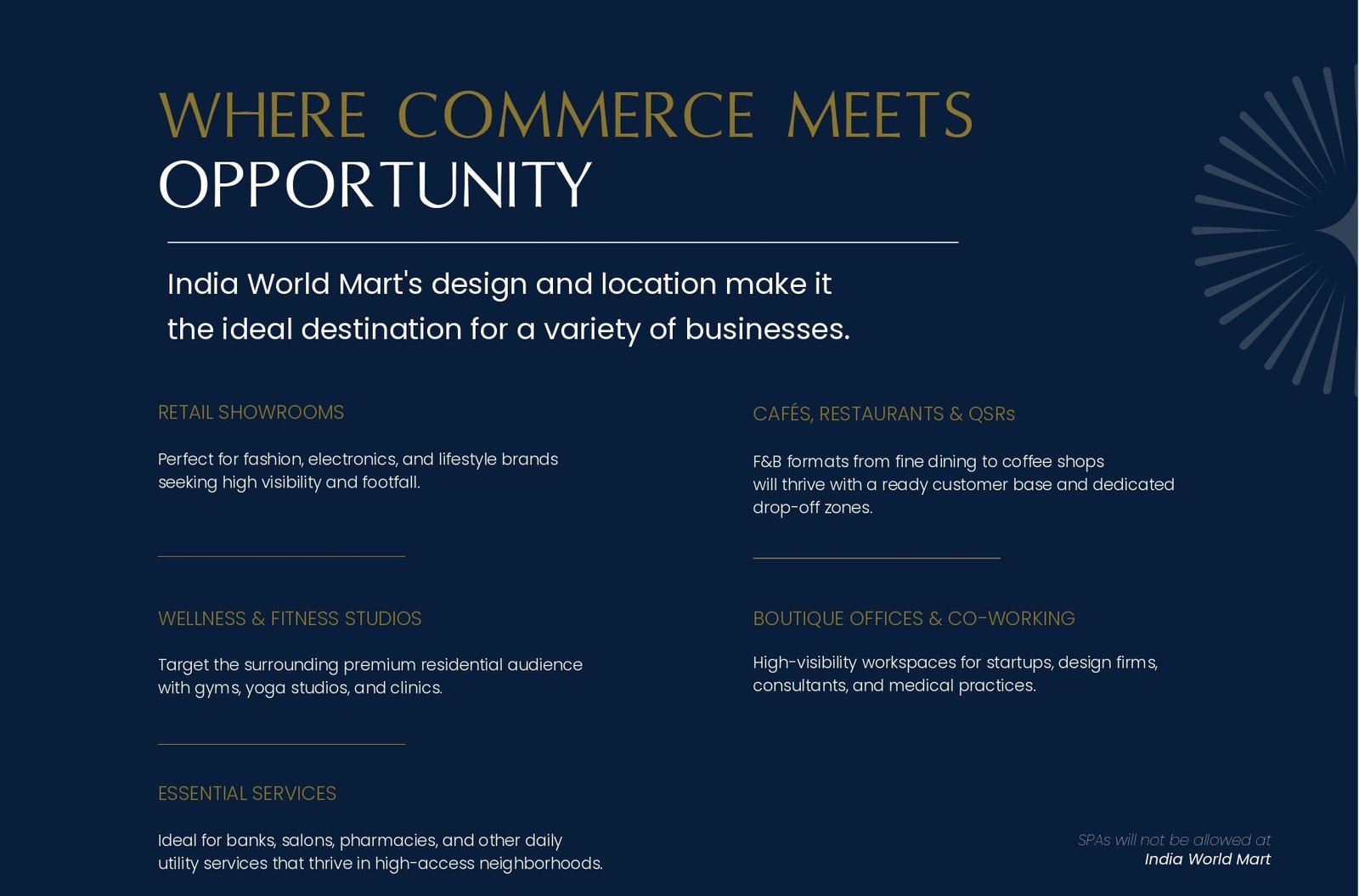 What kind of businesses are suitable for India World Mart? The plots are ideal for retail showrooms, restaurants, financial institutions (banks), corporate offices, healthcare clinics, and service centers.