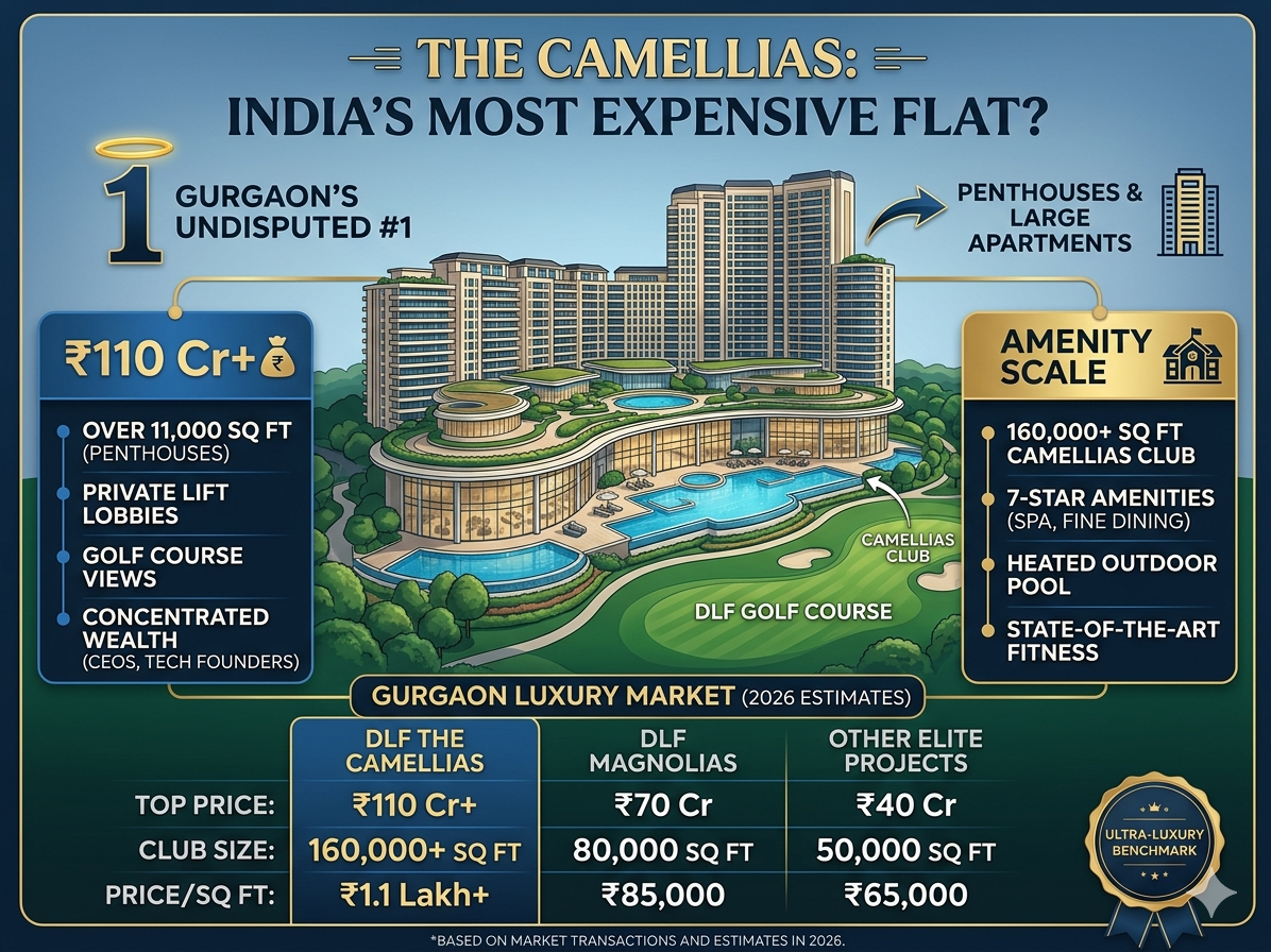 India’s most expensive flat DLF Camellias India’s most expensive flat in gurgaon : Work on DLF The Camellias, located in Golf Course Road Gurgaon, is a well-known name of the most luxurious and expensive apartment address in North India. As of early 2026, it has established numerous hallmarks for luxury living, with the distant high-end residential towers in Manhattan or London often used as a comparison.