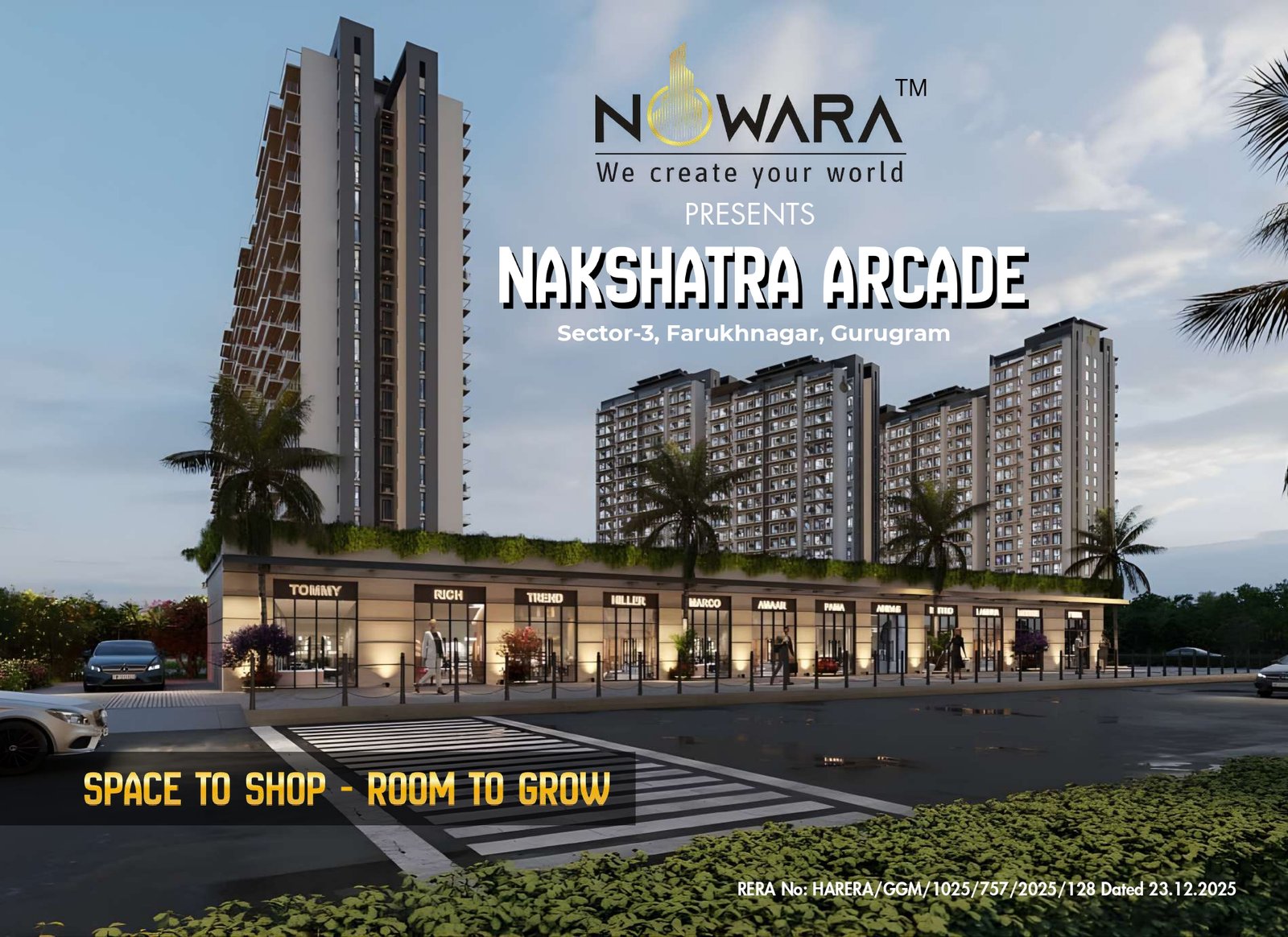Nakshatra Arcade Commercial Shop by Nowara Sector-3 Farukhnagar Gurgaon :- Nakshatra Arcade is a commercial Shop development by Nowara located in Sector-3, Farukhnagar, Gurugram. The project is registered under RERA No: HARERA/GGM/1025/757/2025/128 (dated 23.12.2025).