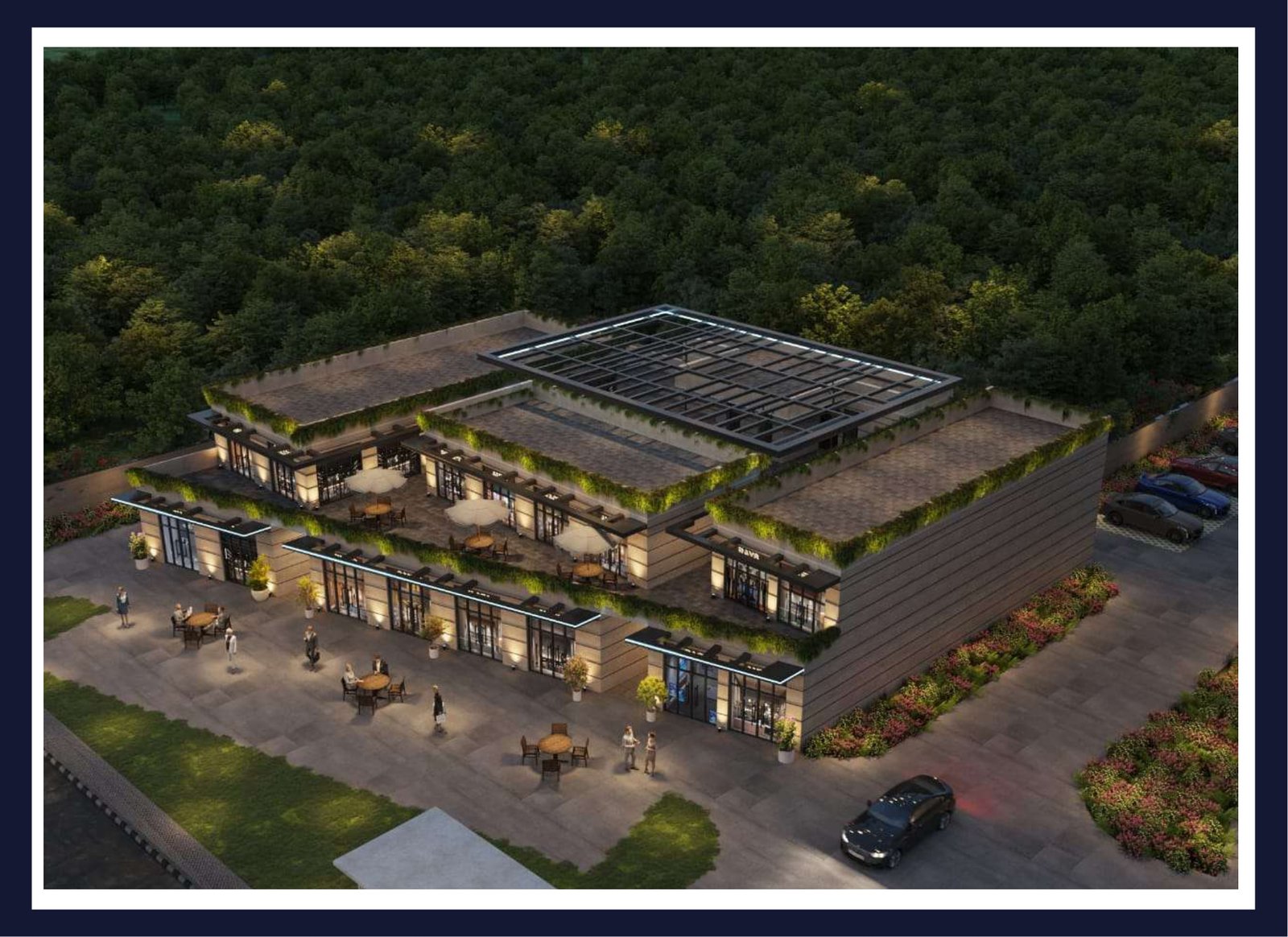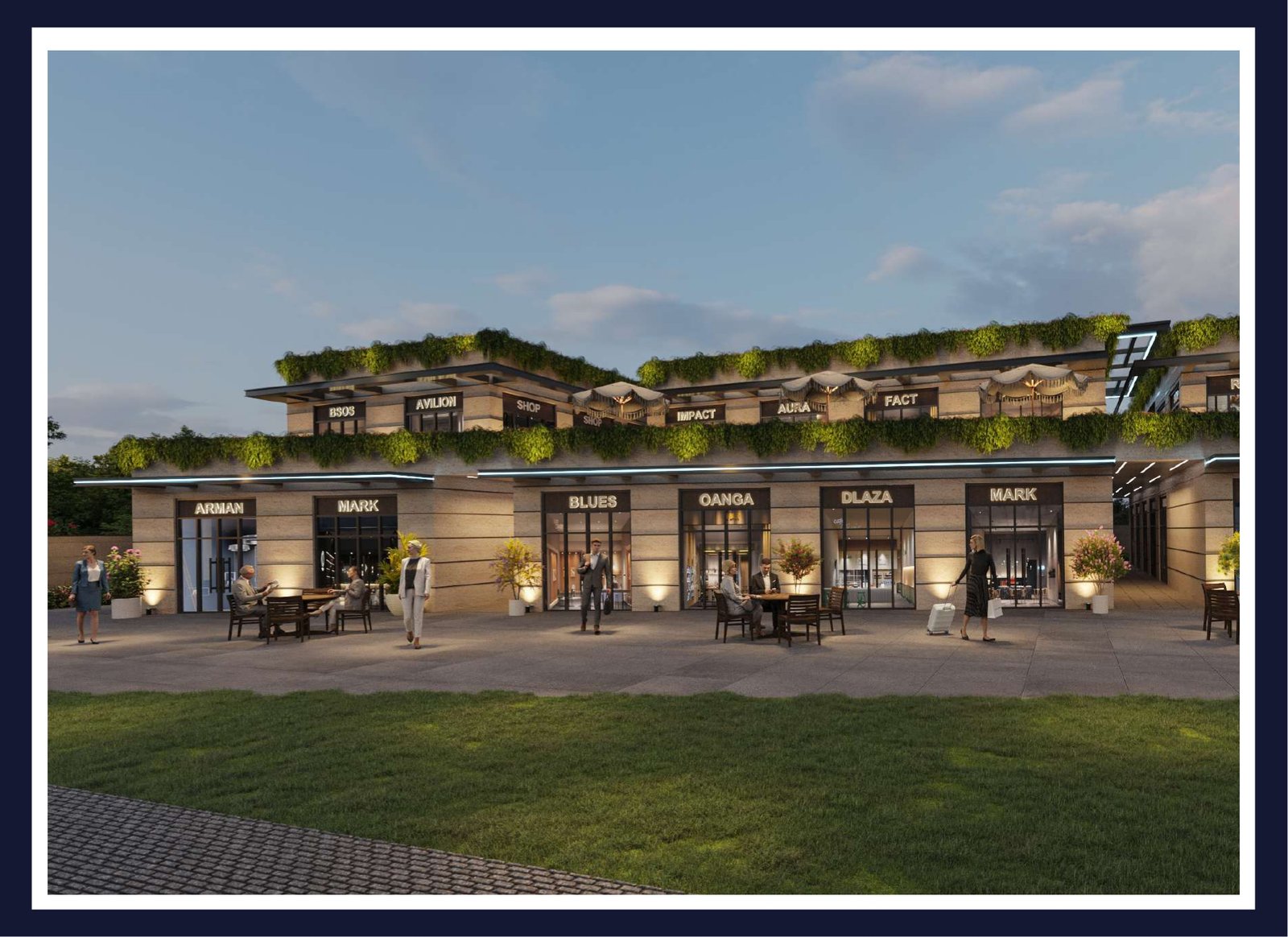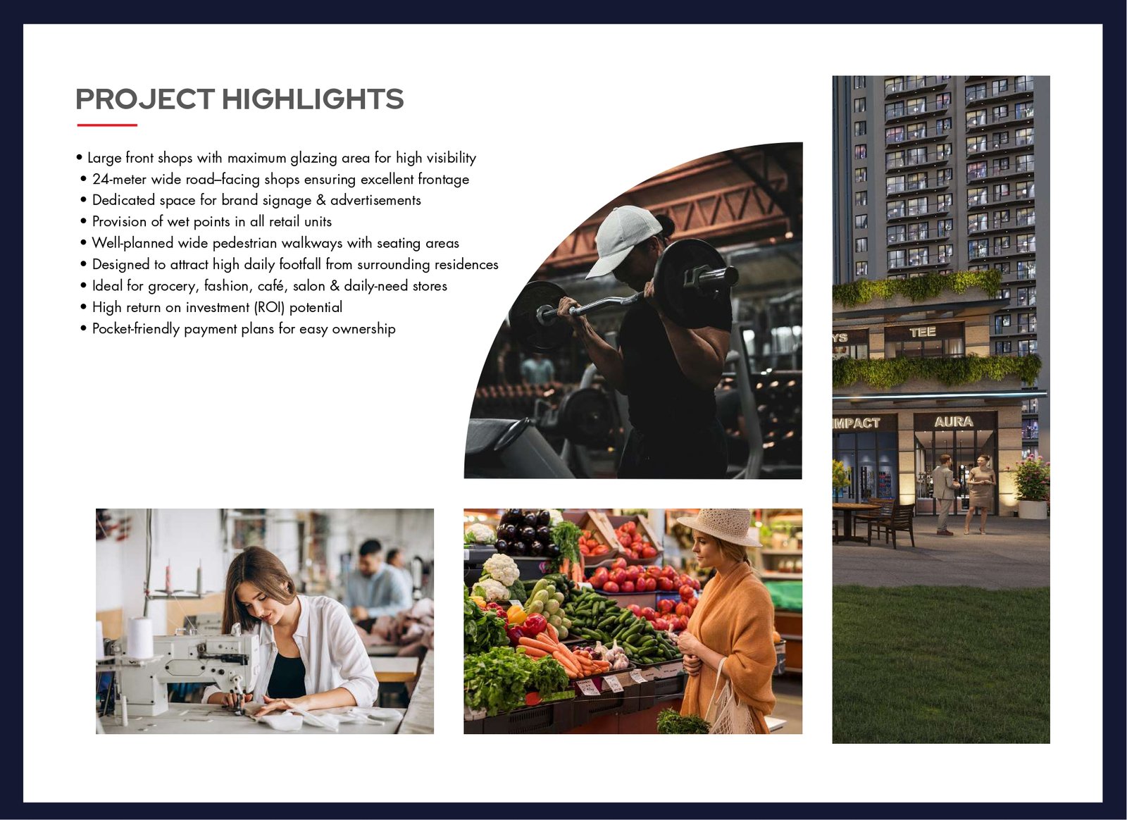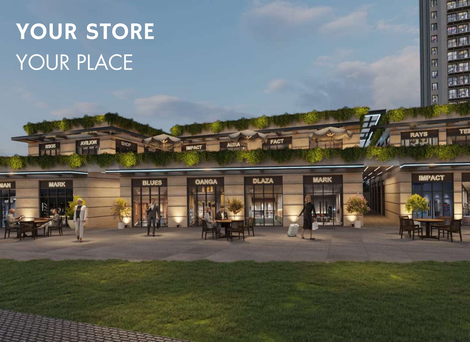 • Shop Design: Large front shops with maximum glazing for high visibility and dedicated space for brand signage.