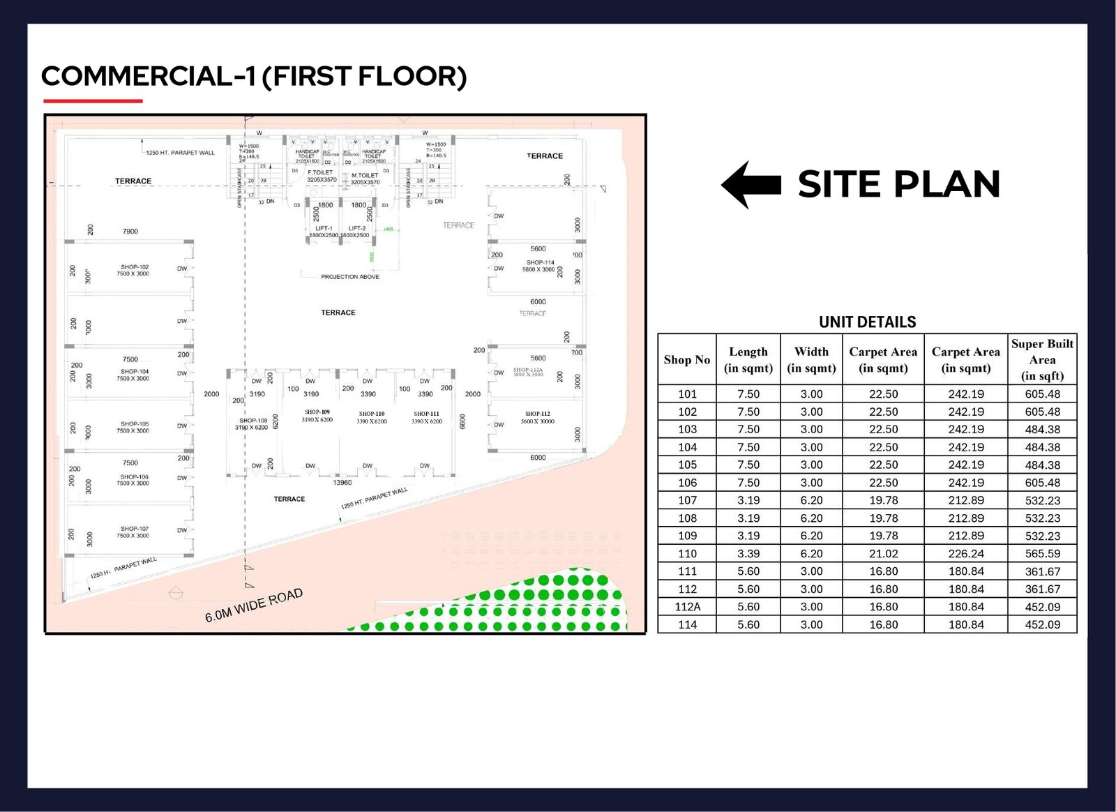 • First Floor: Includes units with carpet areas ranging from approximately 180.84 sq. ft. to 242.19 sq. ft. and super built-up areas reaching up to 605.48 sq. ft..