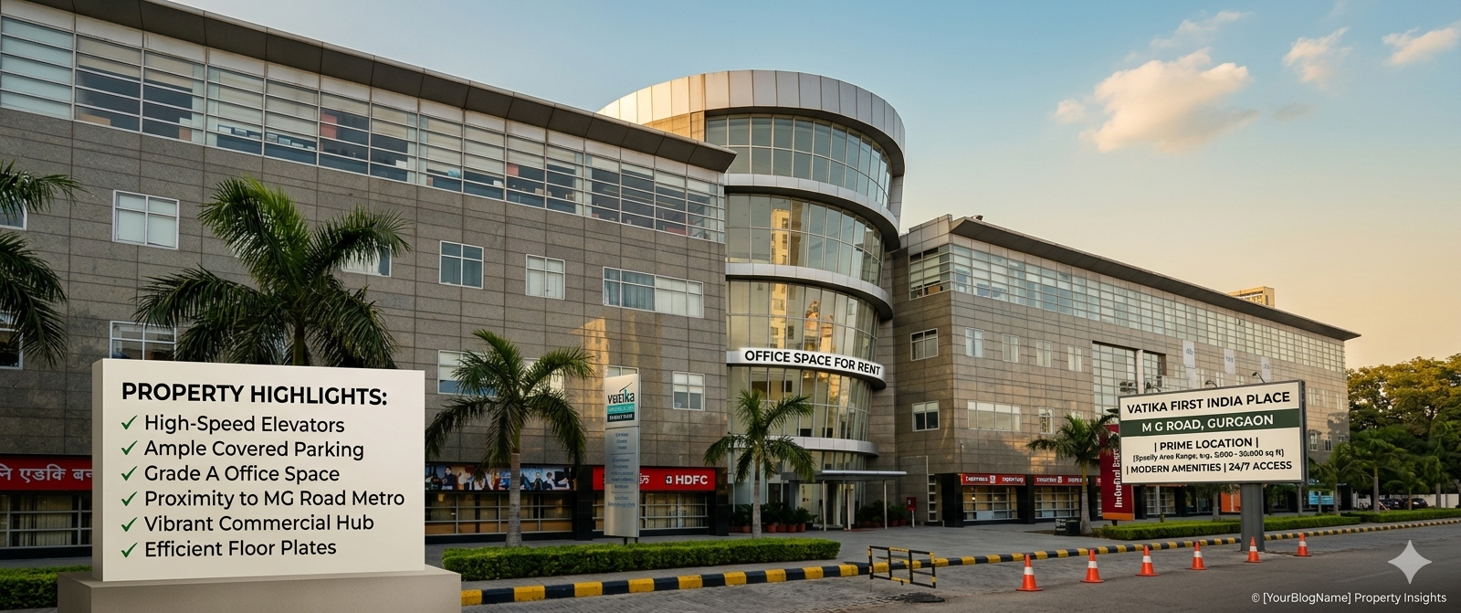 Office Space For Rent in Vatika First India Place M G Road Gurgaon Central Business District, Premium Commercial Office Spaces | Welcome to Vatika First India Place — a landmark commercial office complex in Sector 28, Gurugram (Gurgaon), Haryana on Mehrauli-Gurgaon Road (M.G. Road) — one of the city’s mature and high-visibility business addresses. This office space caters to all — startups, corporate teams, professional services and enterprise firms; an ideal mix of location, connectivity and infrastructure.