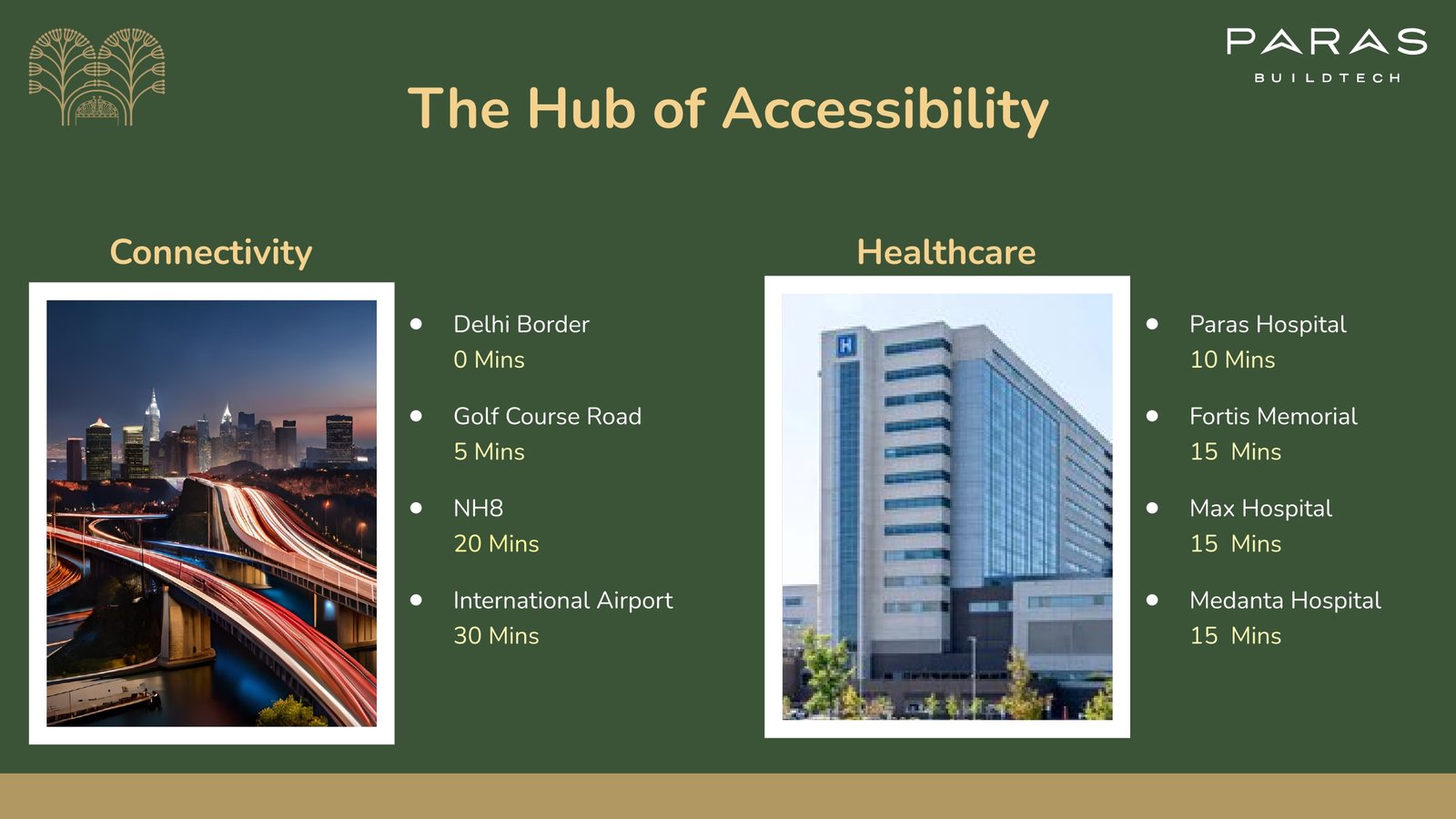 Healthcare Excellence: Proximity to world-class medical facilities including Paras Hospital (10 mins) and Fortis Memorial, Max, and Medanta hospitals (15 mins).
