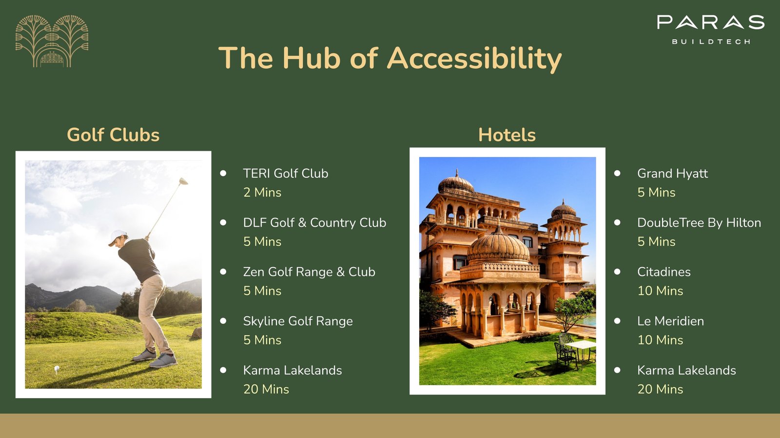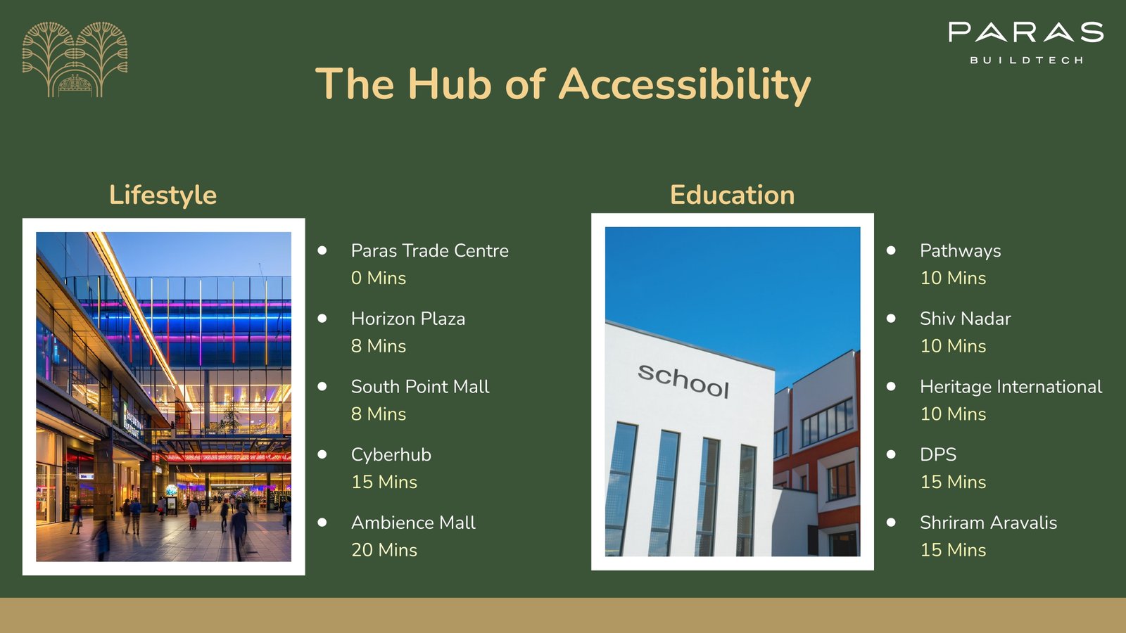 Retail & Leisure: Minutes away from South Point Mall (8 mins), Ambience Mall (20 mins), and Paras Trade Centre (0 mins).