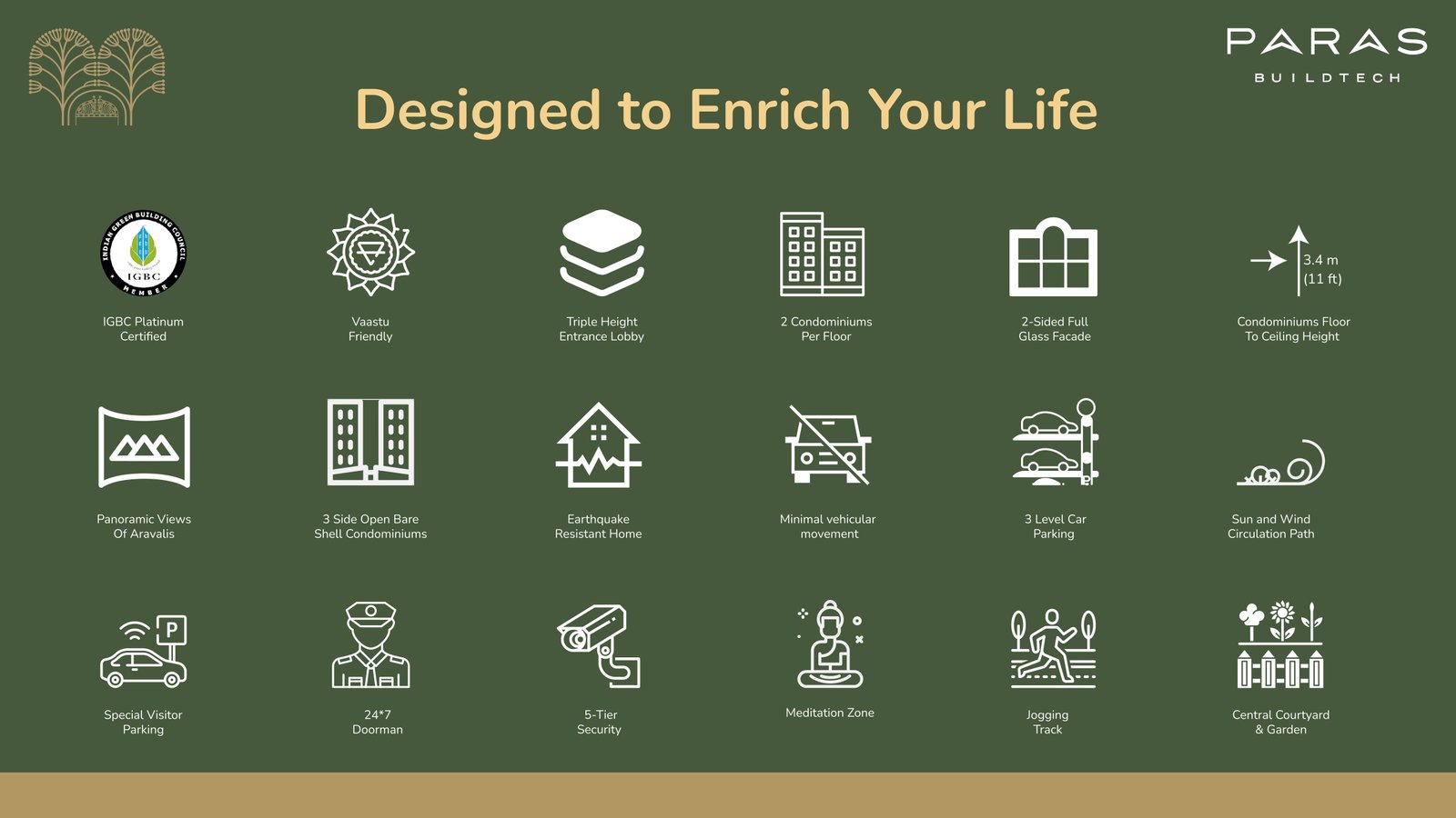Amenities: Designed to provide a “Life Enriched,” featuring grand entrance lobbies, lush landscaped gardens, and dedicated wellness spaces.