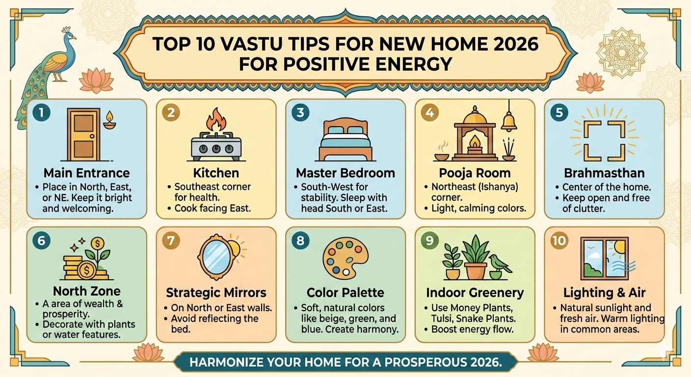 Positive Energy: Top 10 Vastu Tips for New Home 2026 This is an important life decision to make in 2026, whether it be buying a new home from scratch or building one. We all want a place that feels good, a house that brings happiness, peace and good health and a sense of stability. A great location and quality construction are important, in addition to modern design. But nowadays many more people are turning to Vastu Shastra to help them inject positive energy into their homes. Vastu Shastra is an ancient Indian science that focuses on striking a balance between the natural elements such as earth, water, fire, air and space. Building or fixing your home according to Vastu ensures proper energy movement in the environment, making it peaceful, healthy and prosperous. So, if you plan on moving or building a new home this year, here are the top 10 Vastu tips for 2026, practical steps to make your home as positive and balanced as it can be.