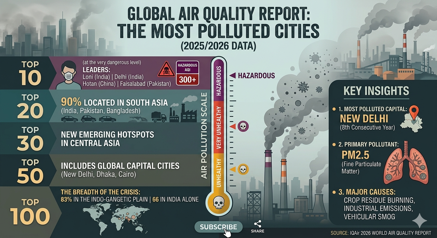 The 2026 Data Insights Key Data Insight: India: India has the largest number of top 100 cities: 66 out of these 100 cities lie in the Indo-Gangetic Plain of India. Rankings of Capital Pollution: New Delhi has been the dirtiest capital city in the world, 8 years in a row (also 8 years in a row) of the 8 largest capitals by capital pollution, with correct capital pollution scores of 99.6 and New Delhi of 82.2 respectively).Most polluted nation: Pakistan has been ranked the first country, with Bangladesh, and Tajikistan coming at the second and third position respectively. Improvement: Although the rankings were high, overall scores in Indian cities such as Delhi declined incrementally by 8% between 2024-2025 because of the tougher dust control and the Grades Response Action Plan (GRAP).