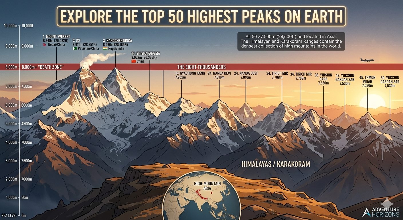 Every single one of the 50 tallest peaks are found within the Himalaya, Karakoram, Hindu Kush, and Pamir ranges. This is because of the extremely large and continuous tectonic collision of Indian Plate with Eurasian Plate. Since this collision involves two thick plates of continental crust (neither of which wants to dive under the other into the mantle), the earth is pushed up more vigorously here than anywhere else on the planet.