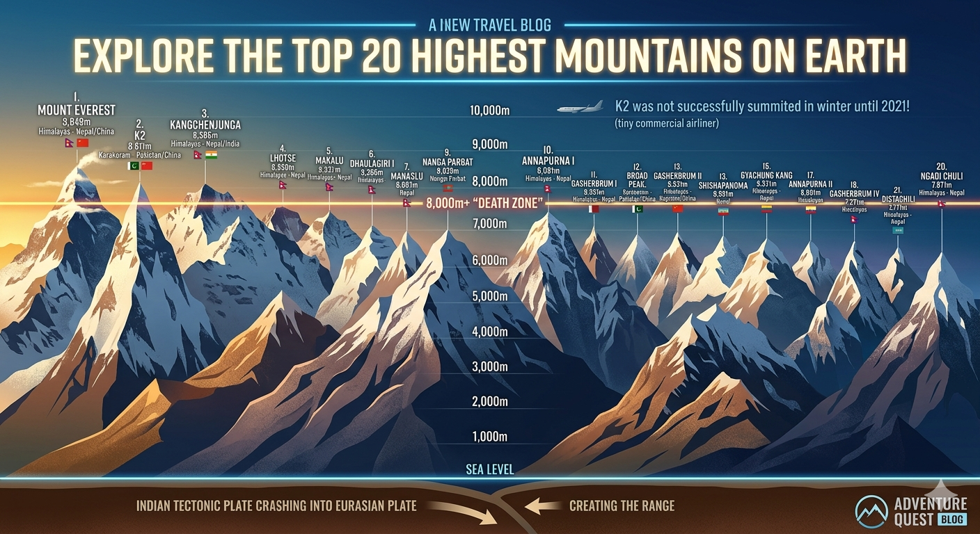 | 1 | Mount Everest | 8,849 | 29,032 | Himalayas | Nepal / China (Tibet) |