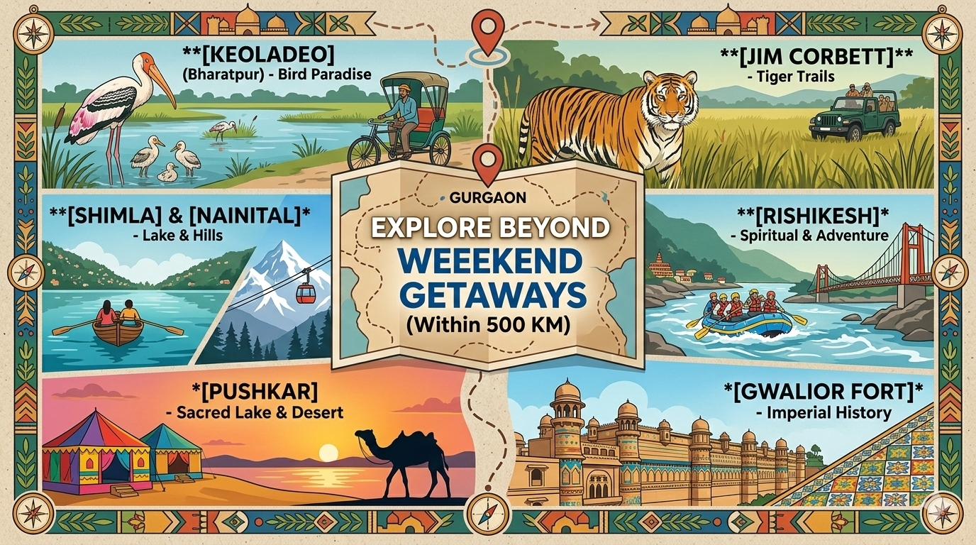 Within a 500 km radius of Gurgaon, you can explore a diverse range of destinations, from world-renowned wildlife sanctuaries and serene hill stations to deeply spiritual towns and historic forts.