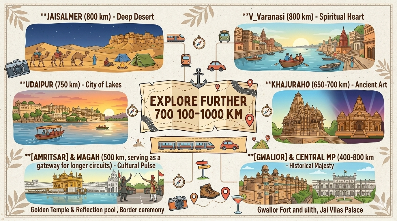 Expanding your travel horizon to 700–1000 km from Delhi brings you to the heart of Rajasthan’s deep deserts, the vibrant culture of Punjab, and the historical majesty of Madhya Pradesh. These trips are ideal for a 3–5 day break.