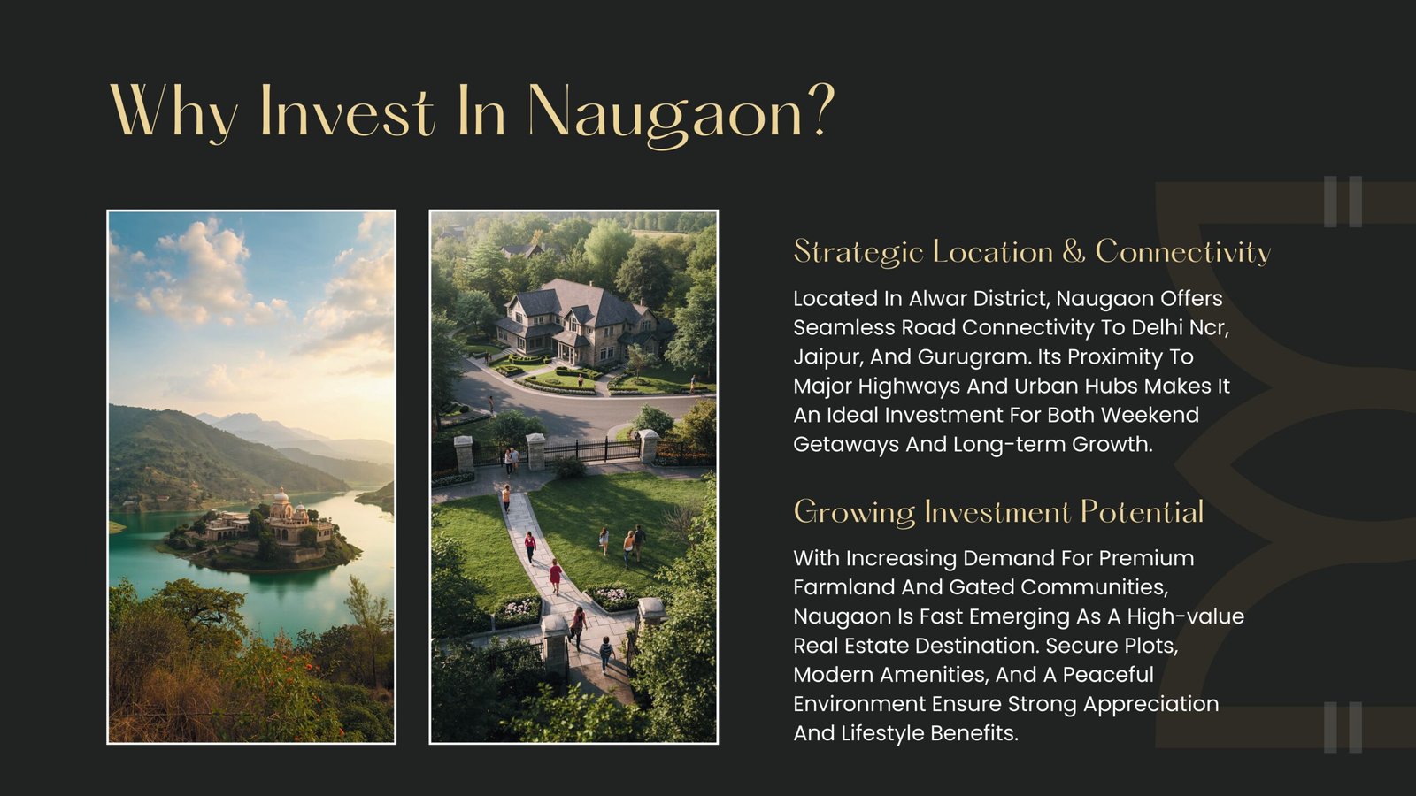 Strategic Location & Connectivity Located In Alwar District, Naugaon Offers Seamless Road Connectivity To Delhi Ncr, Jaipur, And Gurugram. Its Proximity To Major Highways And Urban Hubs Makes It An Ideal Investment For Both Weekend Getaways And Long-term Growth.