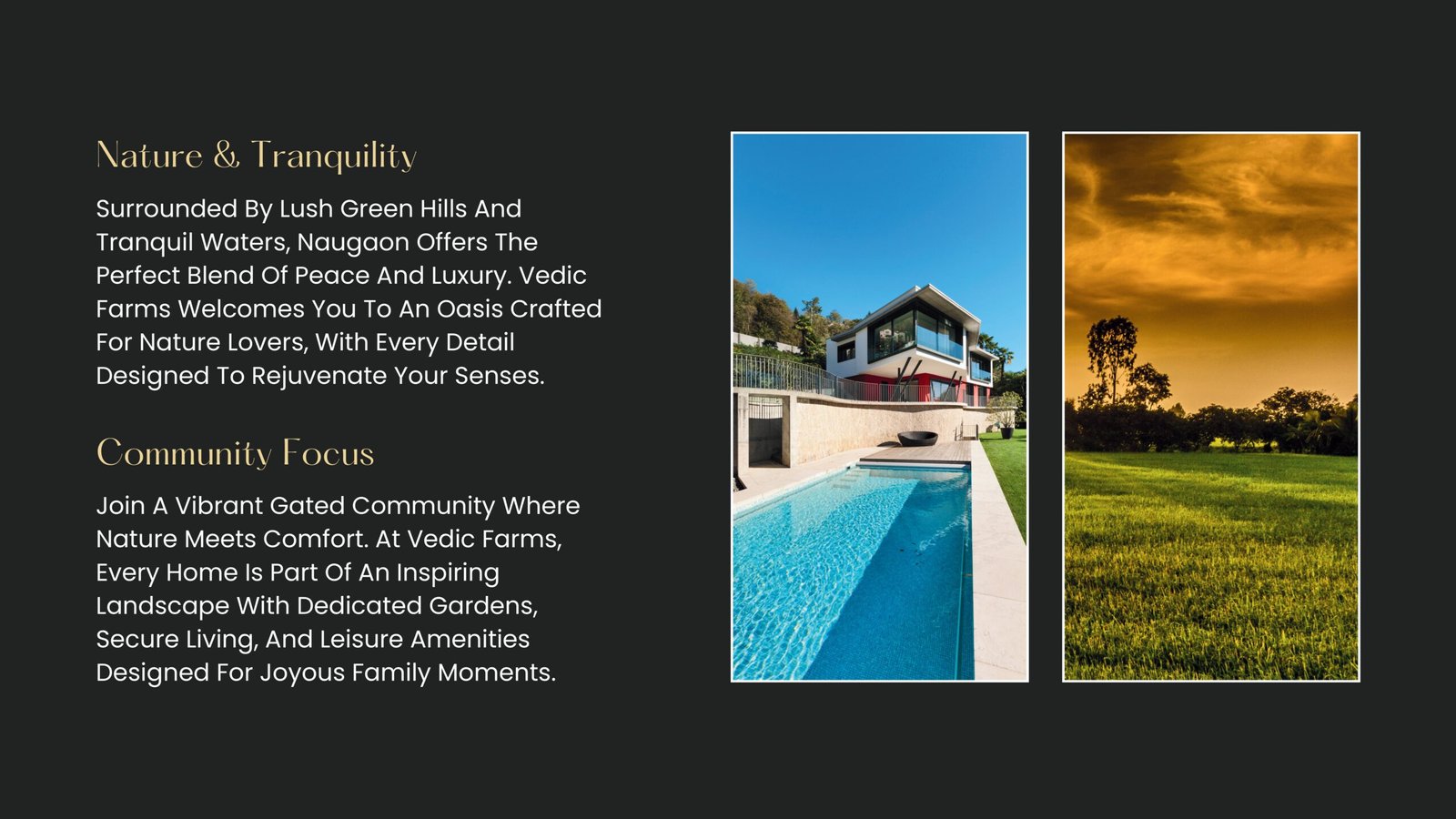 Community Focus Join A Vibrant Gated Community Where Nature Meets Comfort. At Vedic Farms, Every Home Is Part Of An Inspiring Landscape With Dedicated Gardens, Secure Living, And Leisure Amenities Designed For Joyous Family Moments.