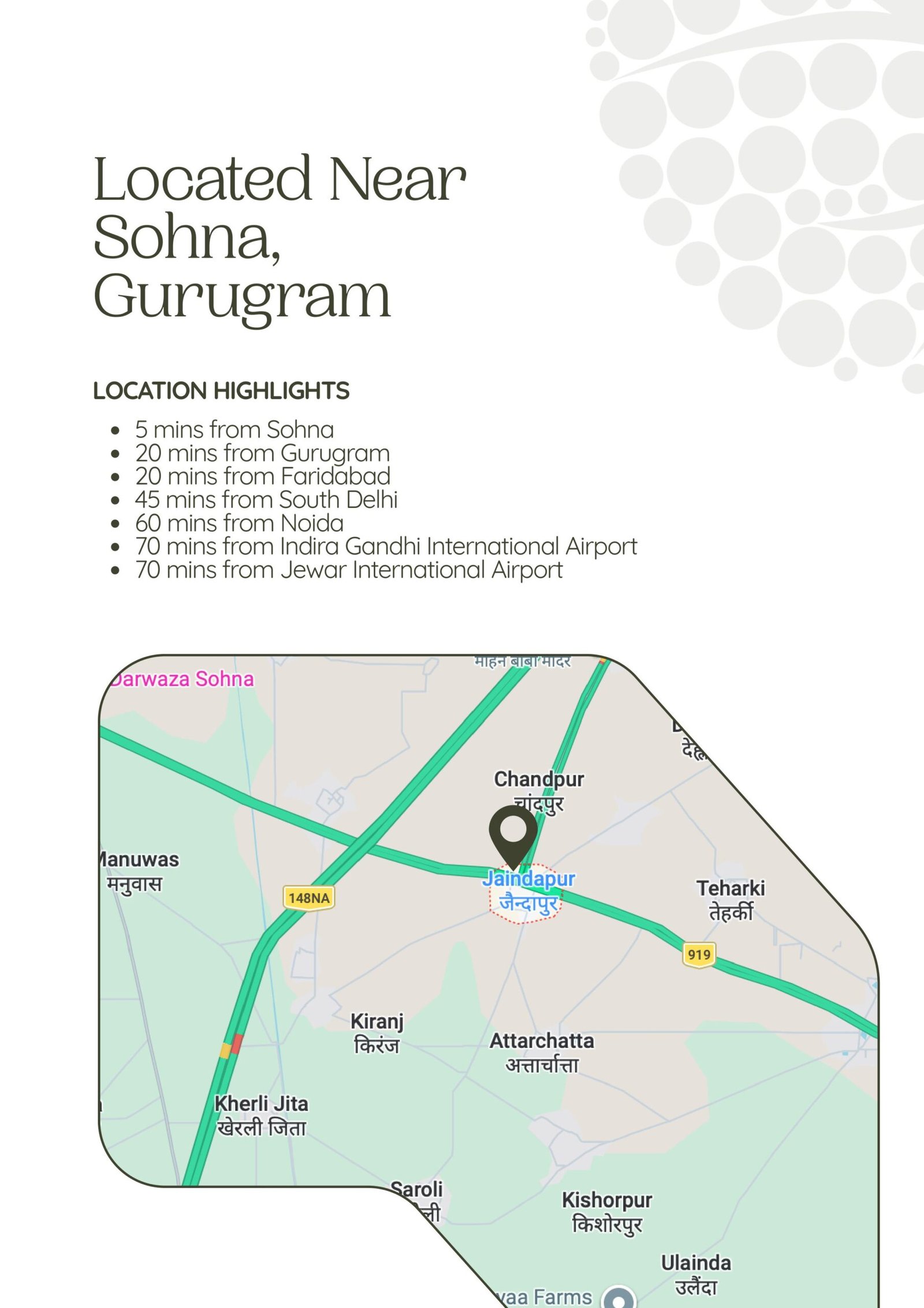 Primary Access: Located at Jaindapur village on the Sohna-Palwal Highway.