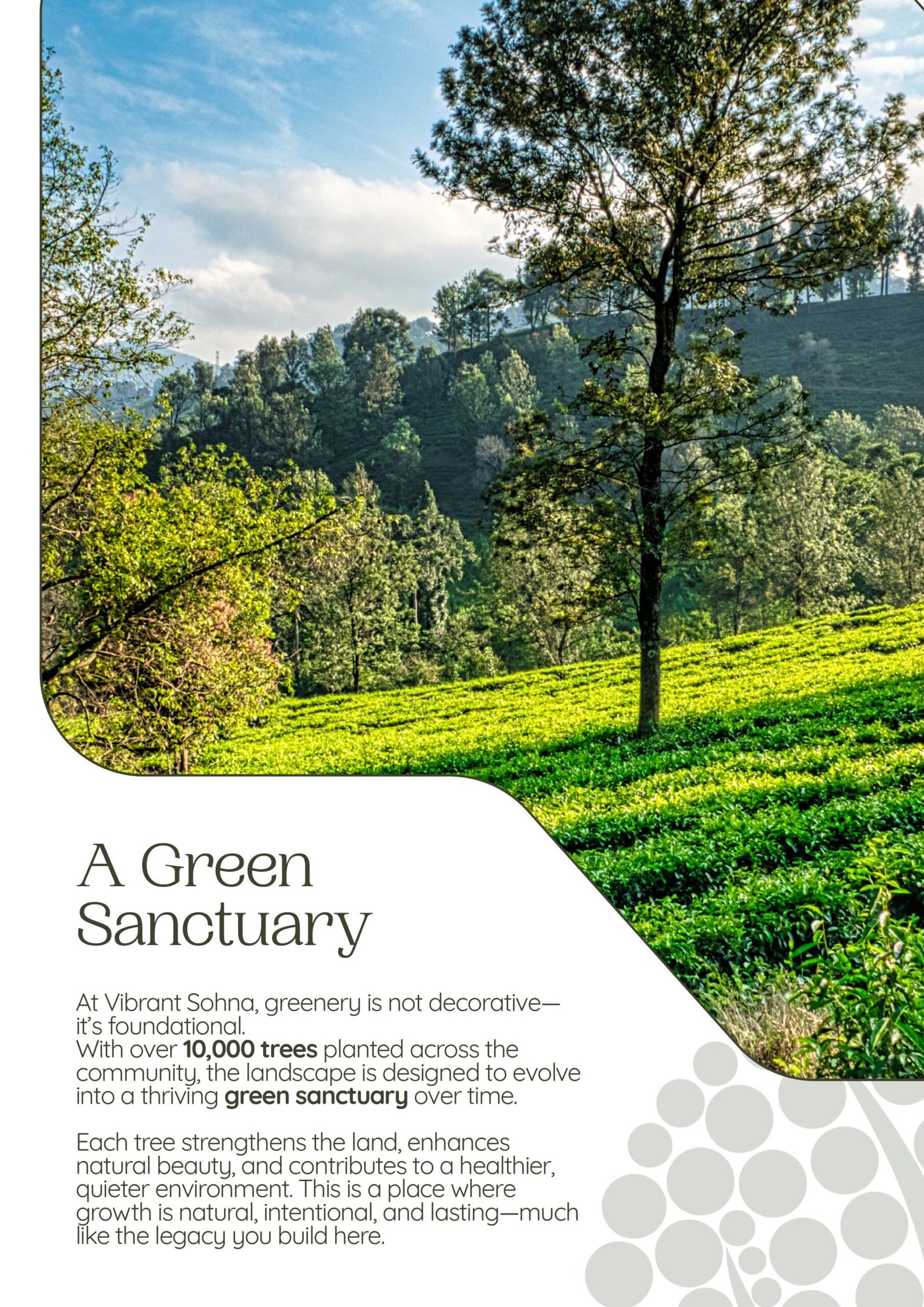 At Vibrant Farm House Sohna, greenery is not just decorative—it is foundational. We have committed to a nature-led design that evolves with time, creating a legacy for generations to come.