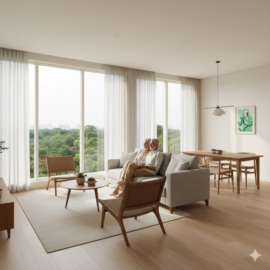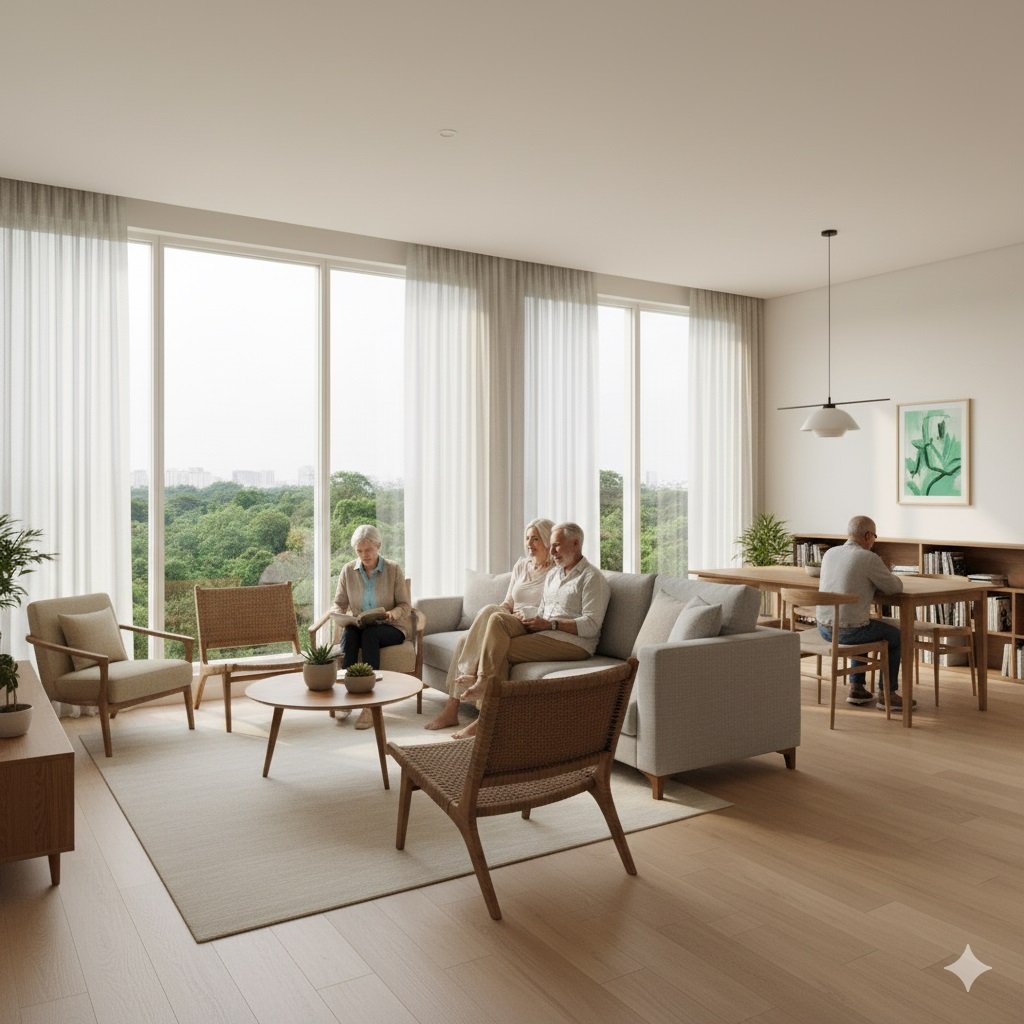 The development focuses on intimacy of senior living with well thought out 3BHK homes promoting ease and independence. Wide streets pedestrian accesses and open areas maintain a balance between movement and contact with nature for its residents. Wellbeing is the essential note of functionality and beauty, which combines modern comforts with natural environments in the interiors.
