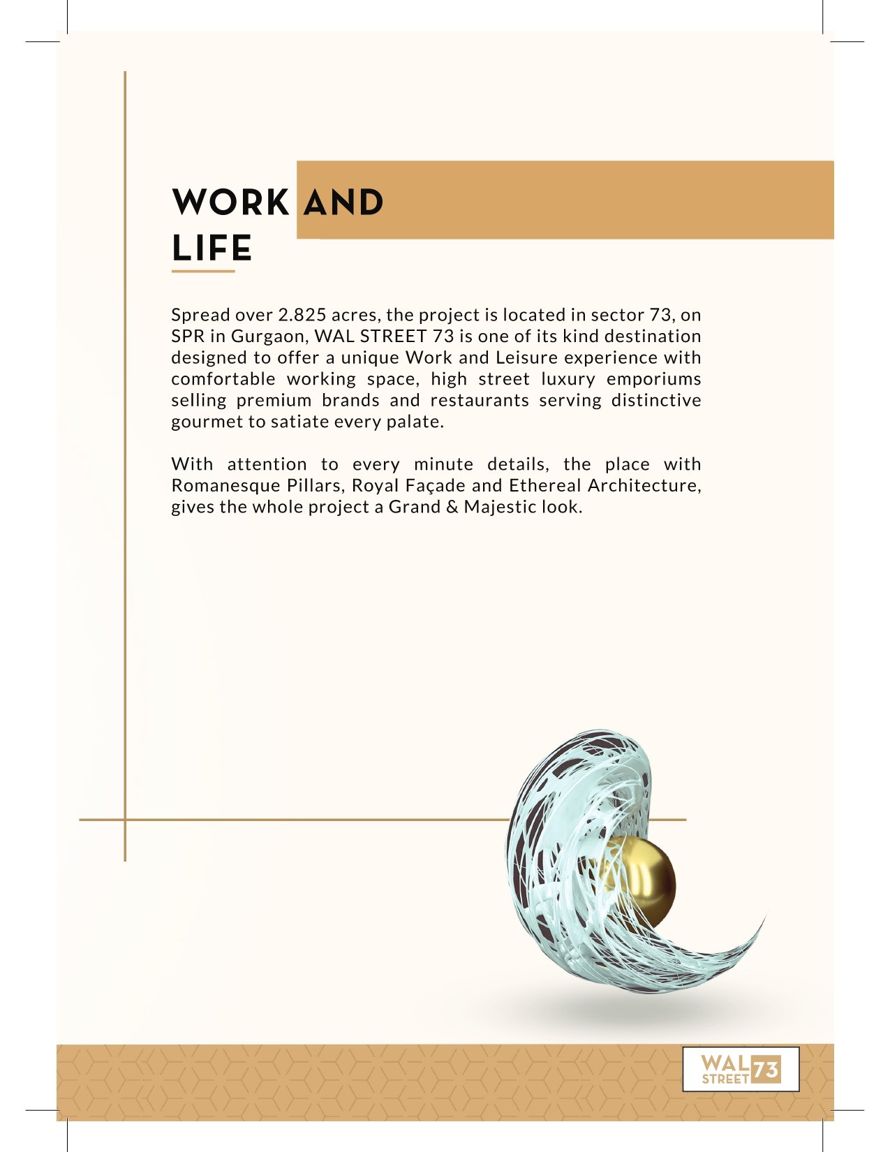 Wal Street 73 | Luxury SCO Plots on SPR Road Gurgaon Experience the Future of Commercial Excellence Welcome to WAL STREET 73, a one-of-a-kind destination in the heart of Gurgaon designed to offer a unique blend of work and leisure. Spread over 2.825 acres, this project is a paradigm of craftsmanship and extravagance.