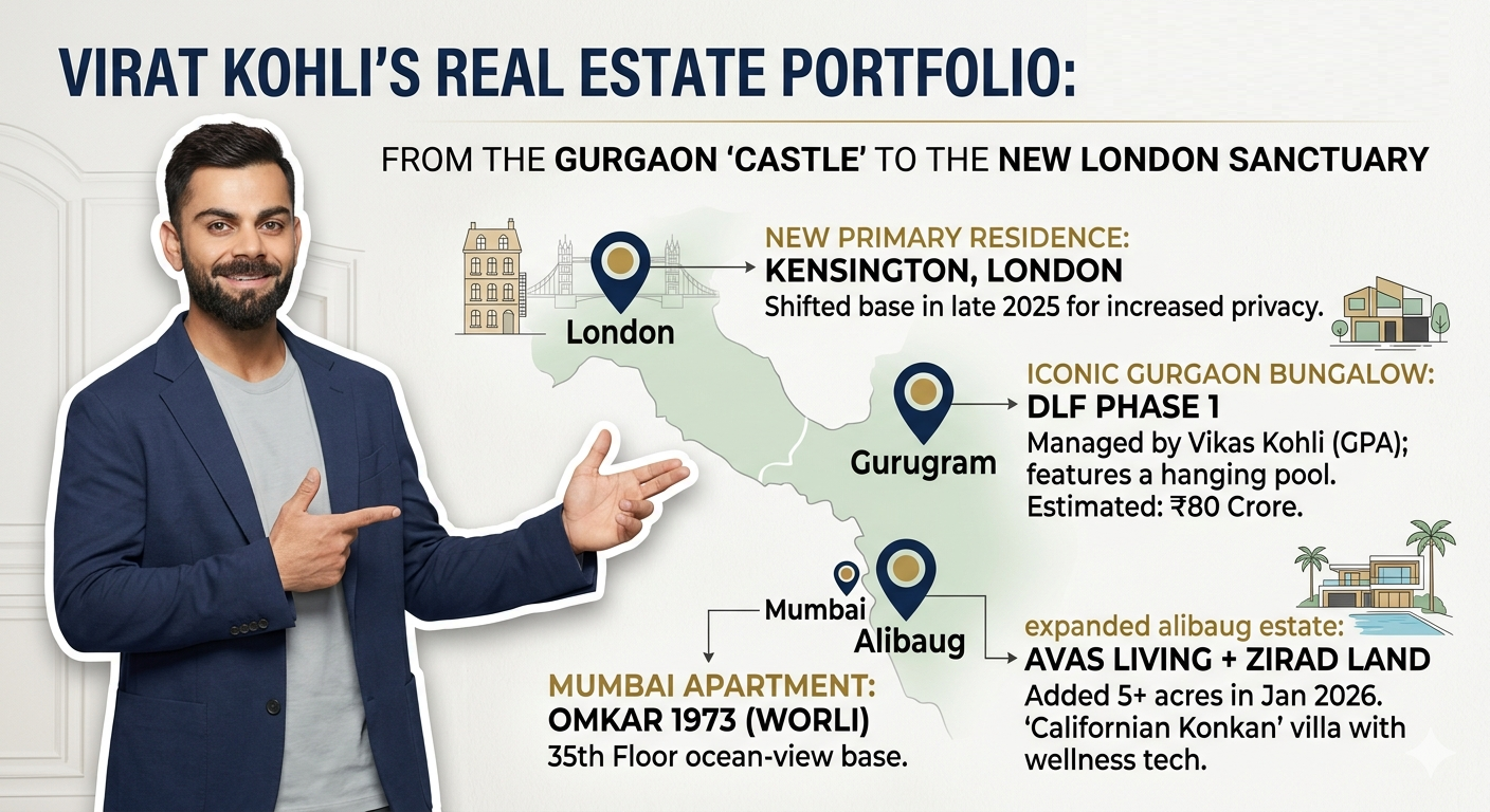 Where is Virat Kohli New Homes? A : Virat Kohli’s real estate portfolio has grown considerably, which is indicative of the movement toward ‘quiet luxury’ and crossborder joint life. Although he still retains his iconic homes within India, the following reads of his “new” homes and recent relocations have raised eyebrows: