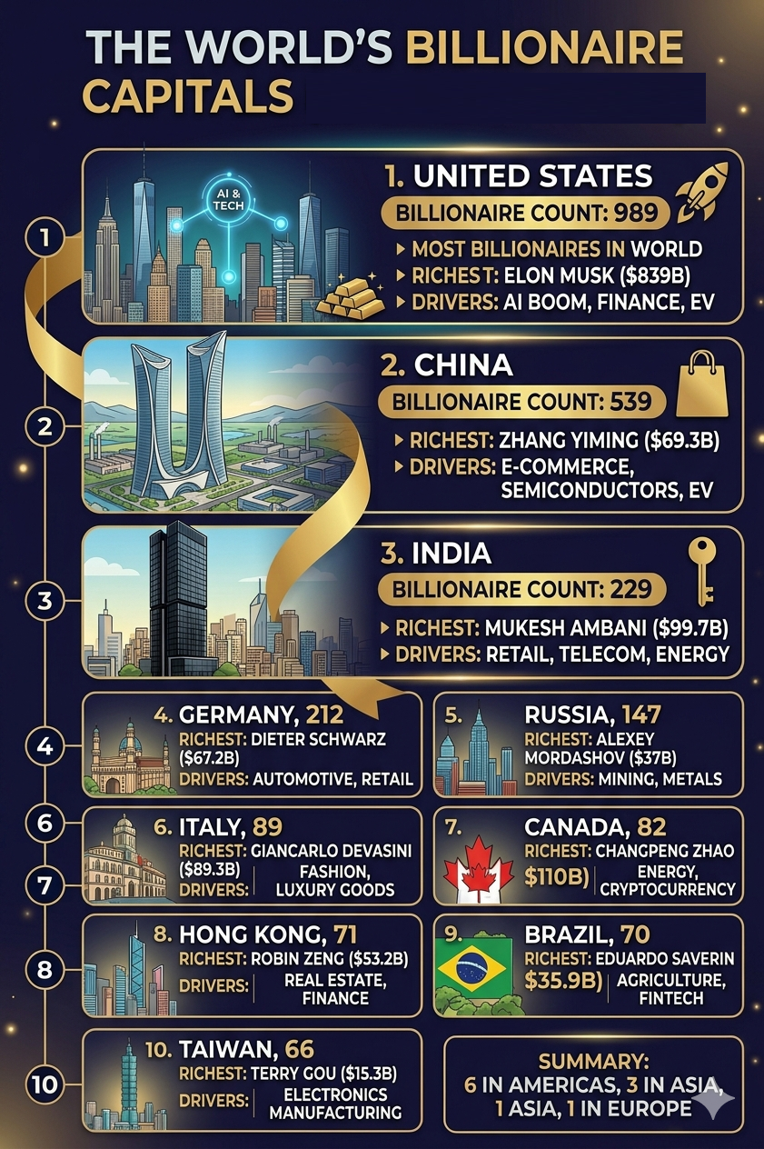 Which country is home to the most billionaires : 2026 and there are now over 3,400 billionaires on the planet, a new high according to Forbes’ latest count. The world’s billionaires are highly concentrated, with the top three countries (the USA, China and India) together house over half of all available tycoons.