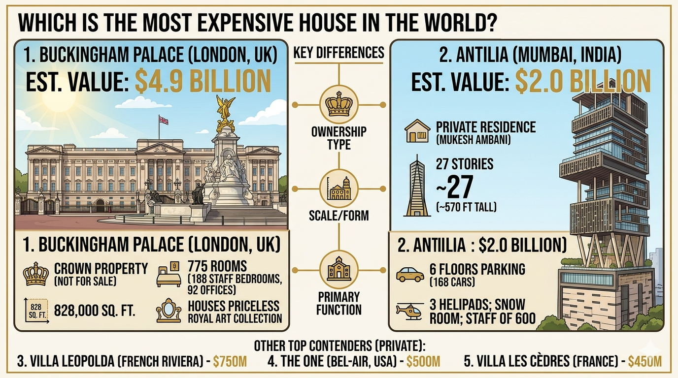 Summary: If you’re looking for the absolute highest valuation, Buckingham Palace is the winner. However, for a home that a private citizen actually built and owns, Antilia remains the undisputed world leader.
