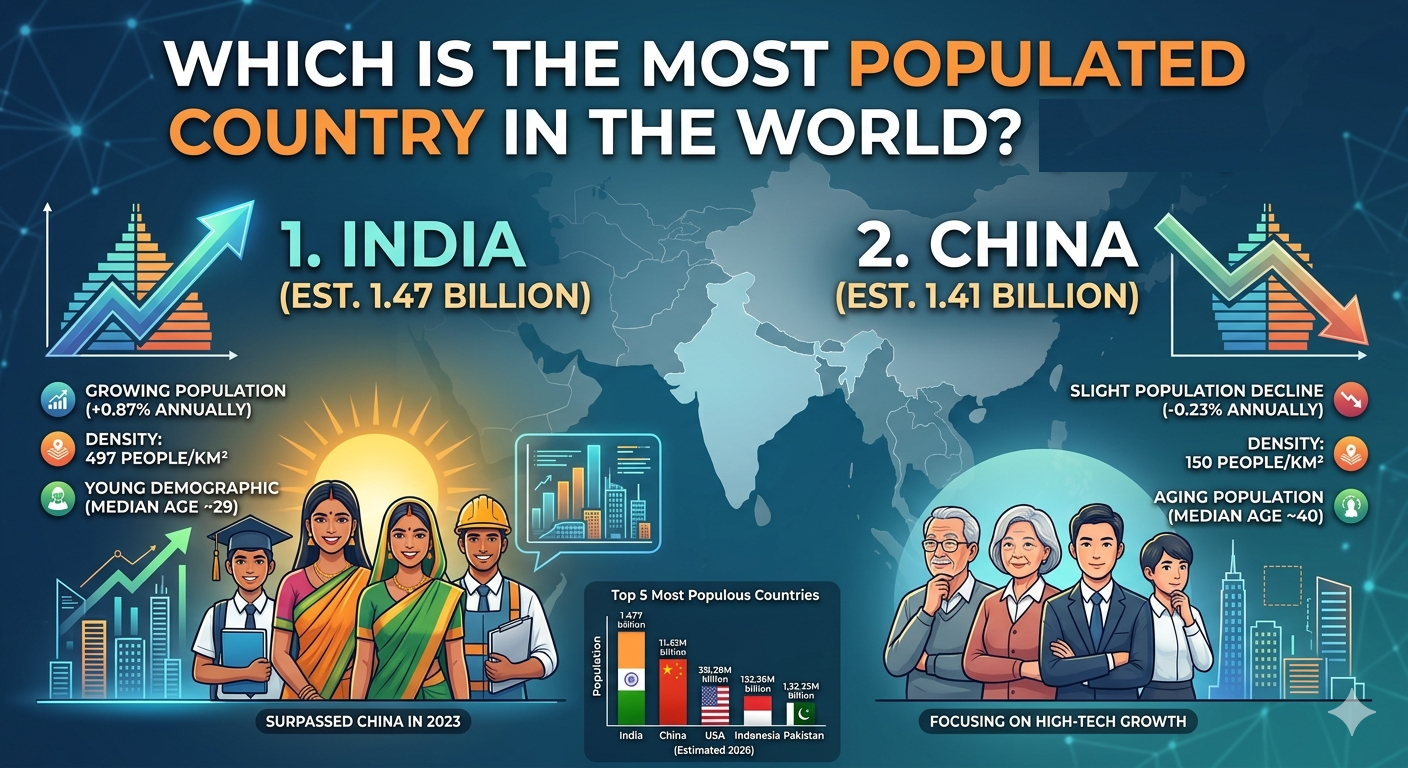 India officially outpaced China in 2023 and has since consistently increased, with China starting to see its population drop slightly. According to recent estimates, the five most populous countries are: