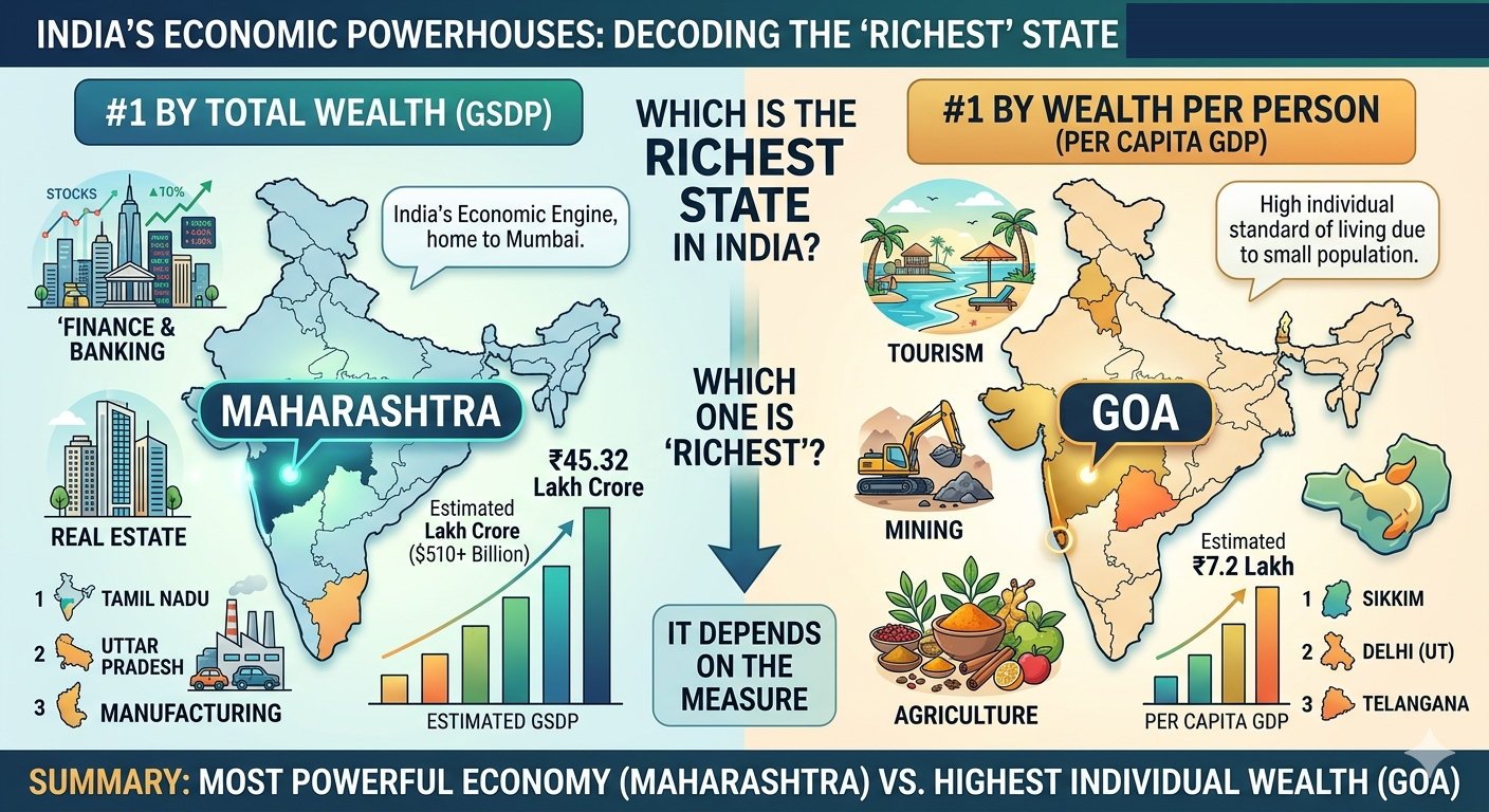 Which is the Richest state in India / Top 5 richest state in India: The richest state in India is usually calculated in two forms: the size of the economy (GSDP) or the wealth per capita (GDP Per Capita). As of 2026, the ranking is as follows: