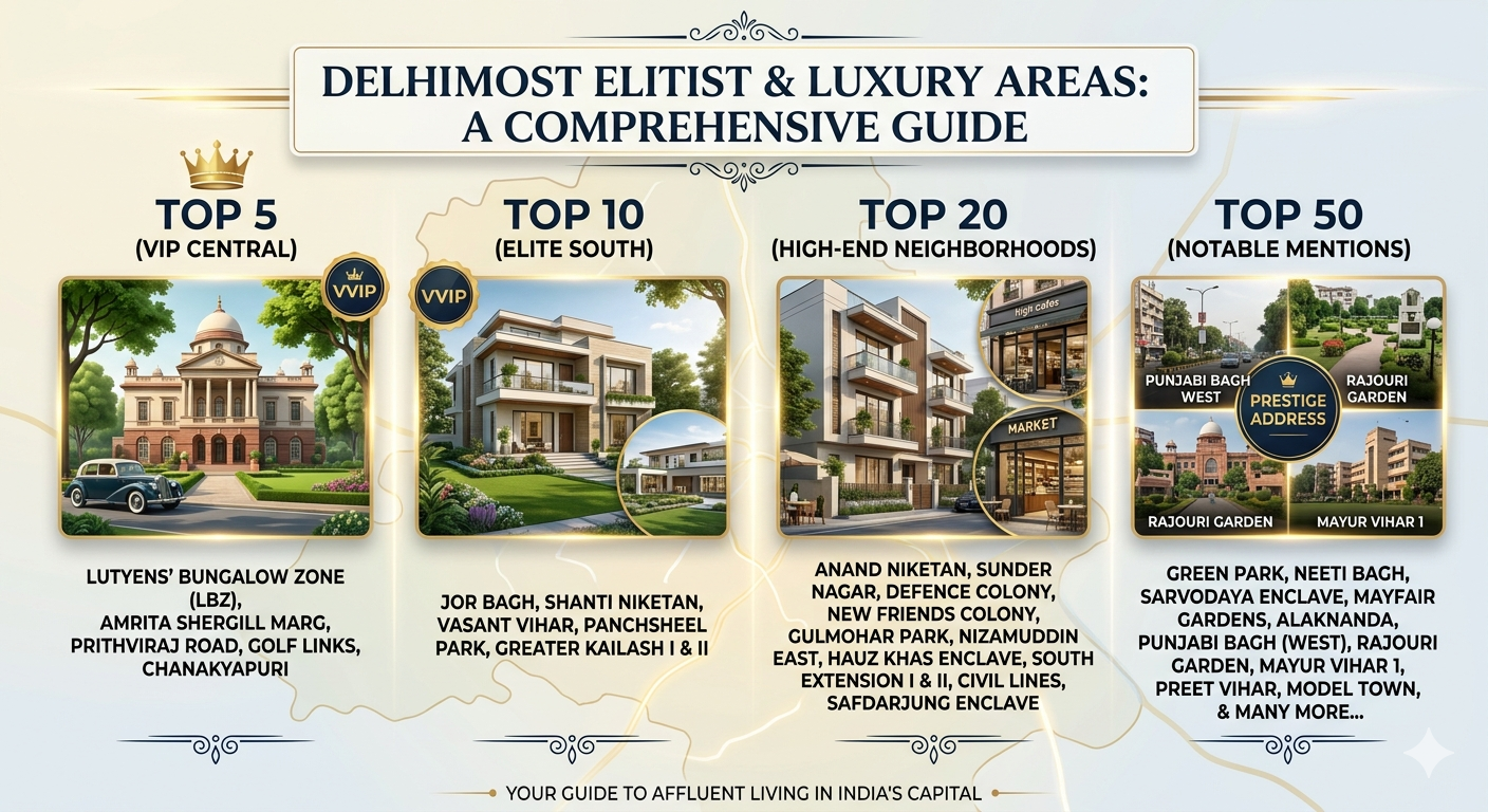 1. Lutyens’ Bungalow Zone (LBZ): The absolute peak of Indian real estate. Home to the Prime Minister, cabinet ministers, and top industrialists.