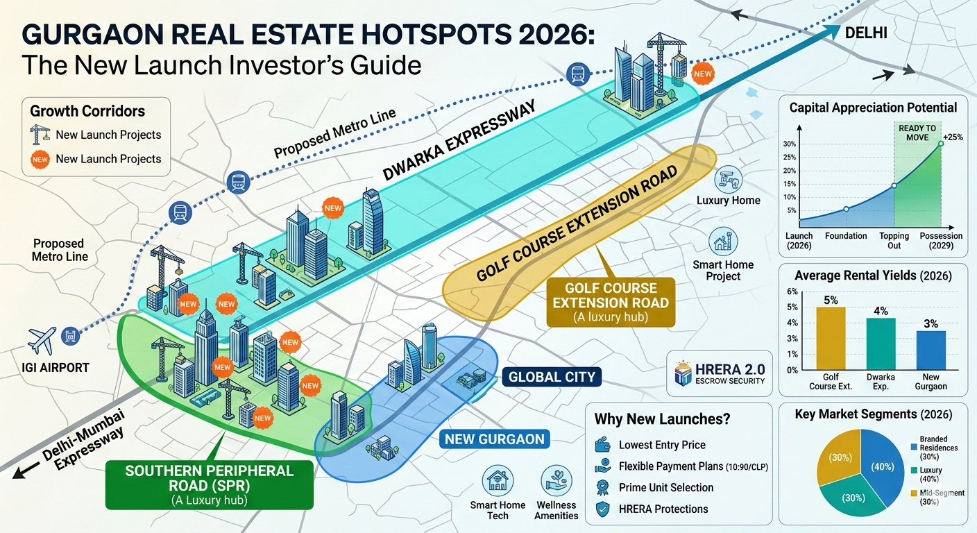 Q Why Investors Focus on New Launch Projects in Gurgaon ? A. Gurgaon (now Gurugram) remains among the top-ranking real estate hubs of India and fetched an estimated ₹86,588 crore investment last year alone, in the year 2026. For an investor, the “New Launch” phase is often regarded as the “Golden Window” to maximize returns.