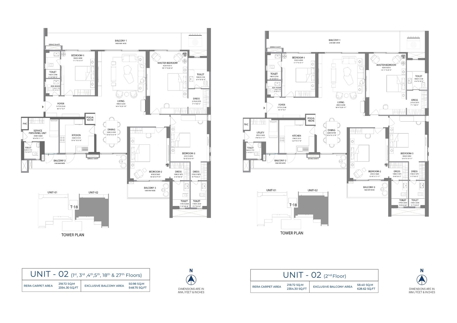 Exclusive Balcony Area: Ranges from 50.98 sq. m. (548.75 sq. ft.) to 58.40 sq. m. (628.62 sq. ft.) depending on the floor